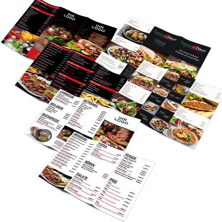 - Zuletzt haben Sie die Möglichkeit eine unserer vielen vorgefertigten Vorlagen auszuwählen. Die Vorlagen sind so gefertigt, dass Sie uns einzig und allein Ihre Produkt-Liste und selbstverständlich Ihre Unternehmensdaten zuschicken und wir diese in Ihre Wunsch-Vorlage einfügen. Das Design und die Grafiken/ Produktbilder werden nicht verändert. Diese Vorlagen sind so unterschiedlich wie möglich. Hier findet garantiert jeder Döner-, Kebab-Imbiss und türkisches Restaurant den passenden Speiseflyer.