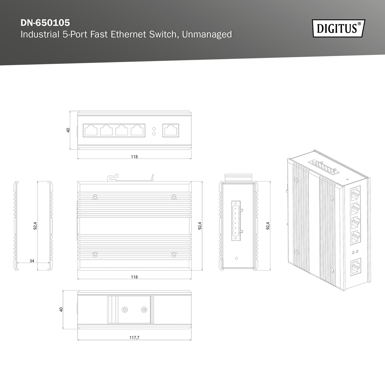 Industrieller 5-Port Fast Ethernet Switch DIN rail, erweiterter Temp.Bereich