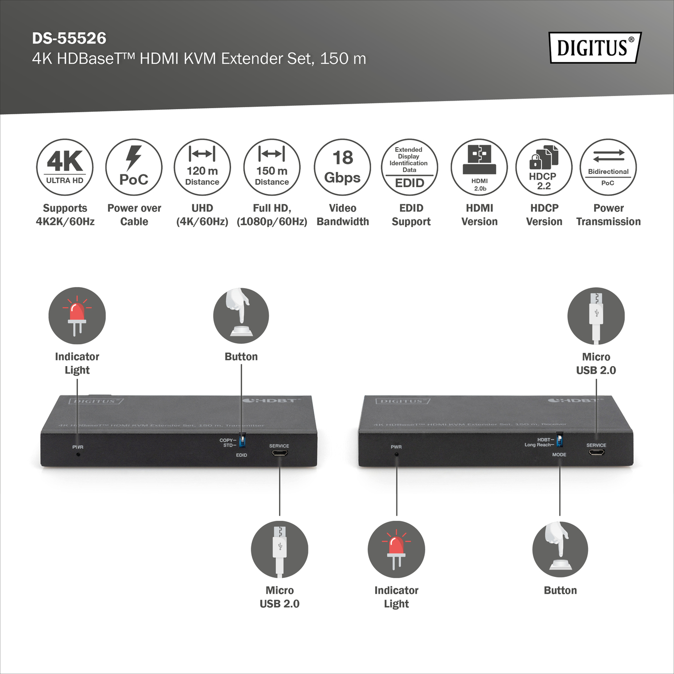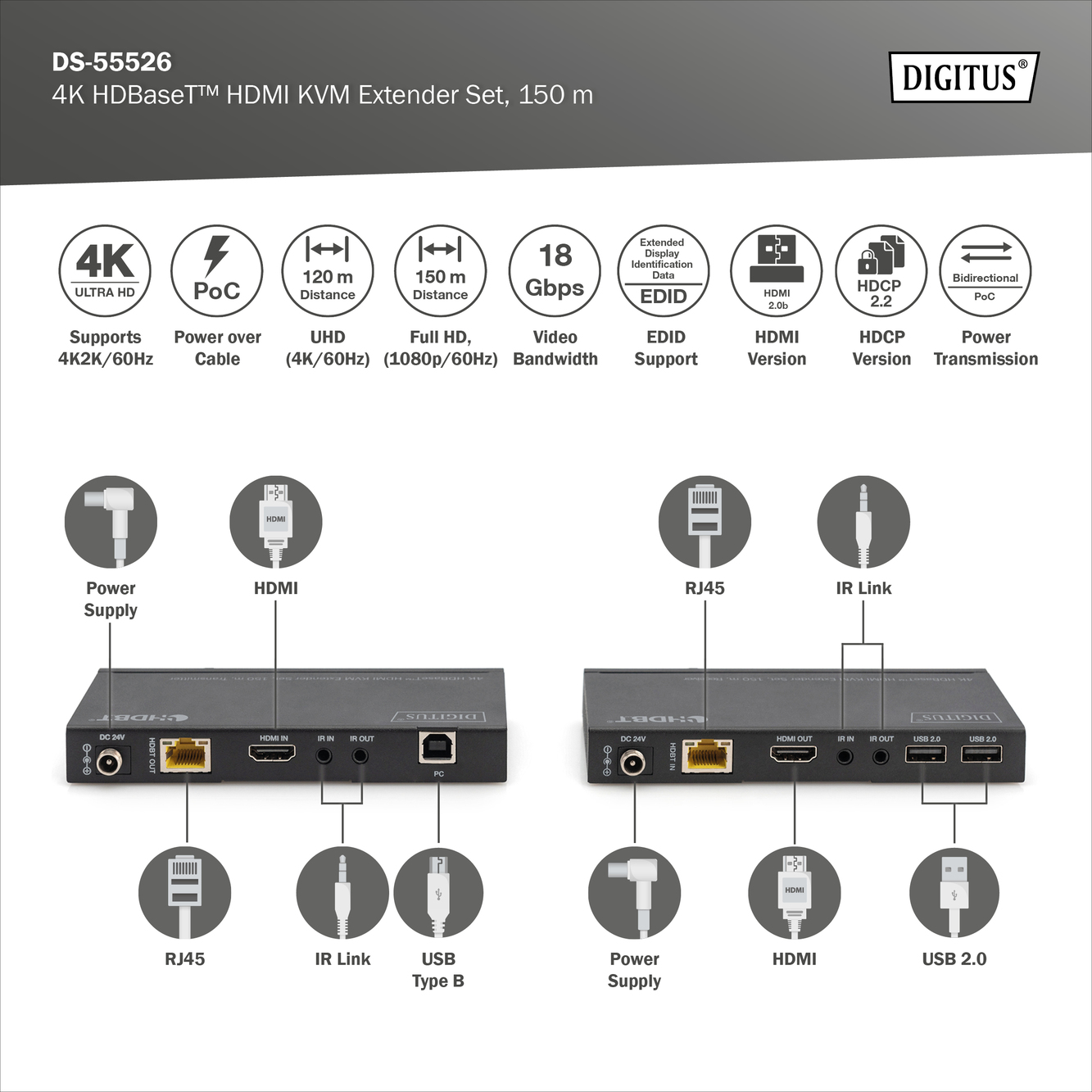4K HDBaseT™ 2.0 HDMI KVM Extender Set, 150 m