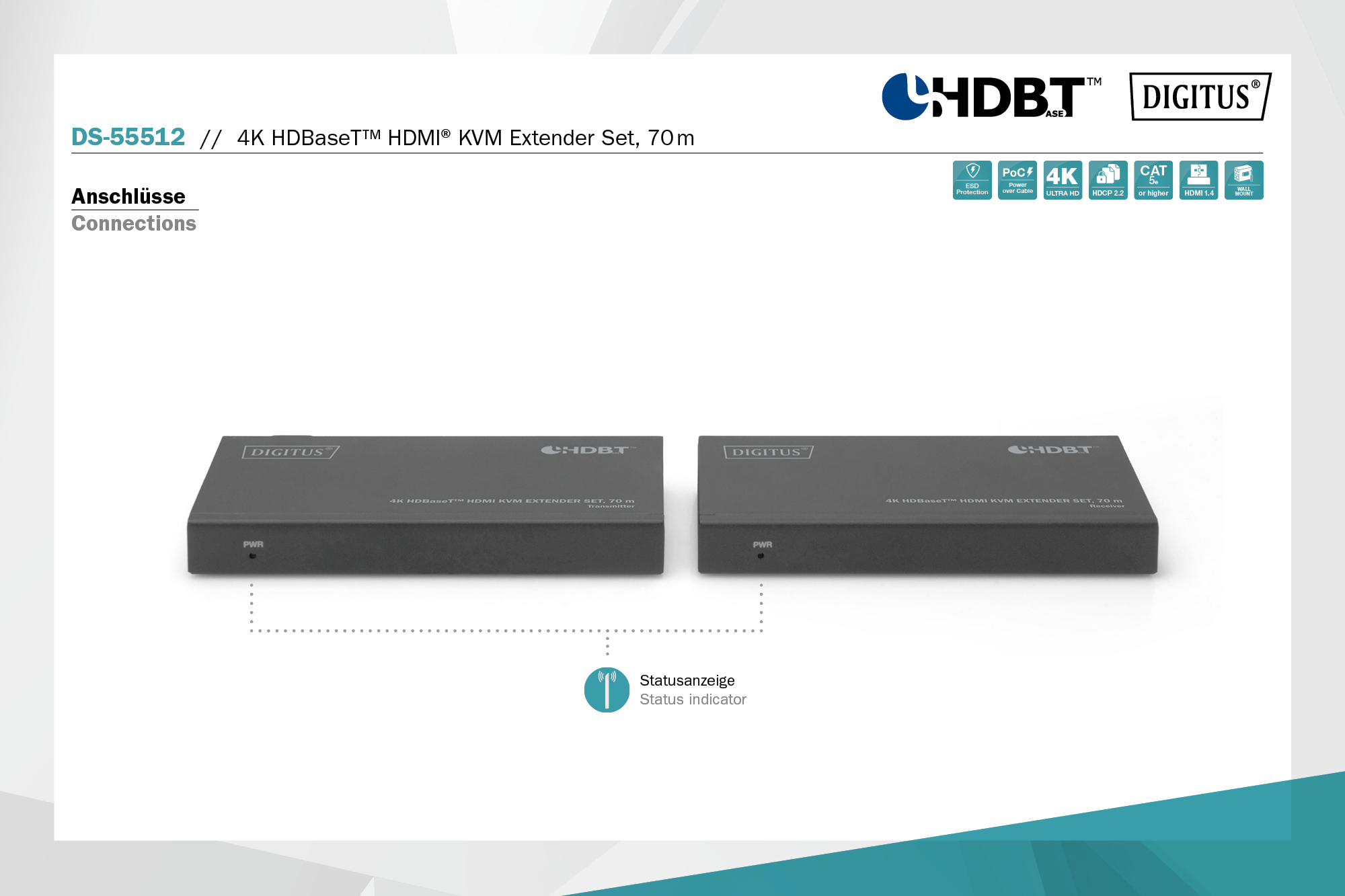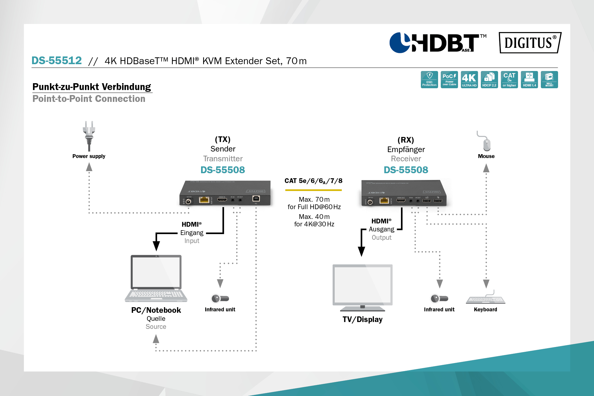 HDBaseT HDMI KVM Extender 4K/30Hz, 70 m, 10.2 Gbps, HDCP 2.2
