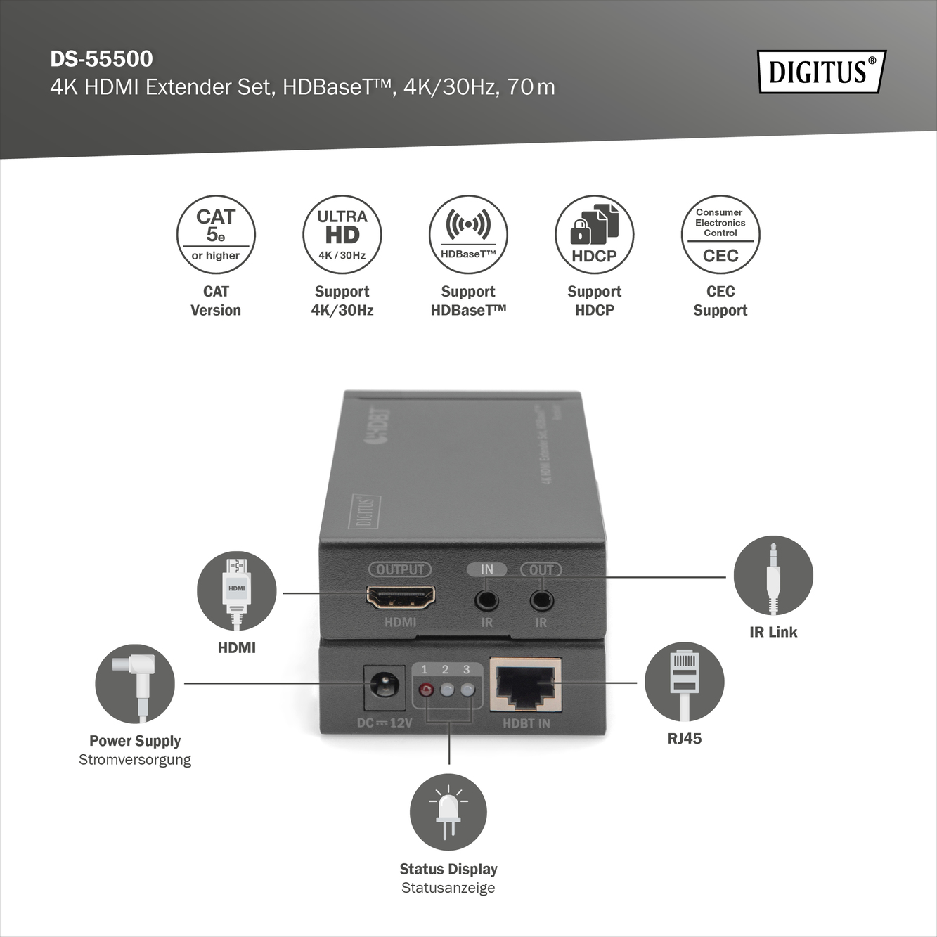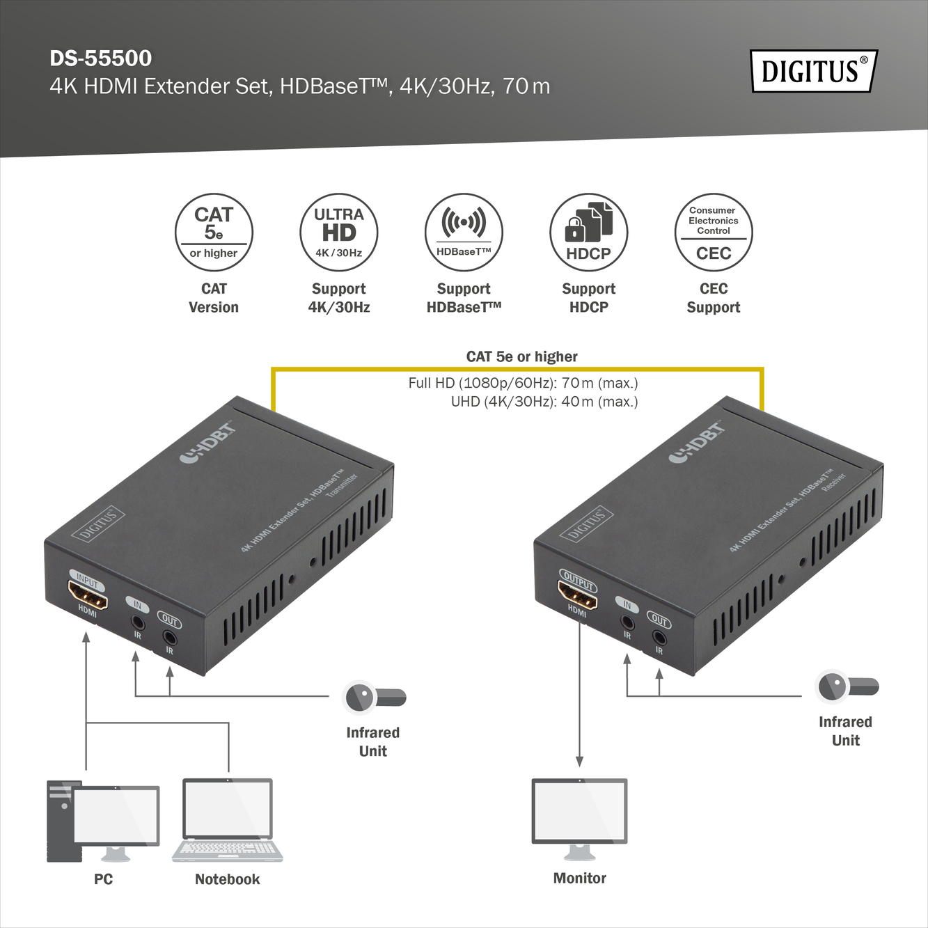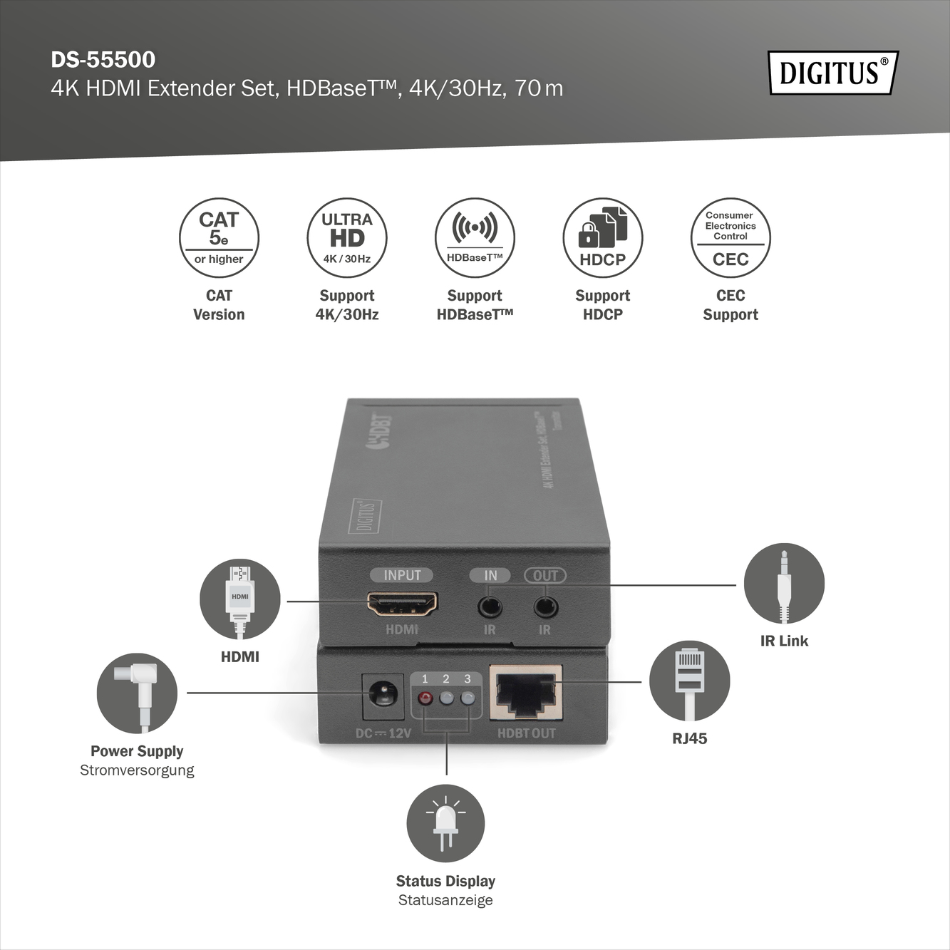 4K HDMI Extender Set, HDBaseT™, 4K/30Hz, 70 m