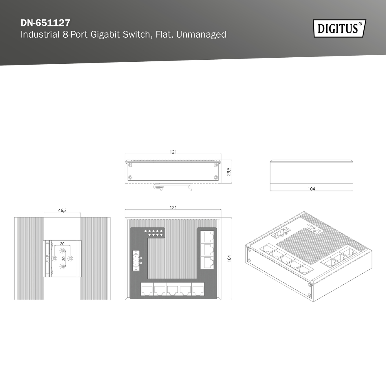 8 Port Gigabit Ethernet Netzwerk Switch, Flat, Industrial, Unmanaged