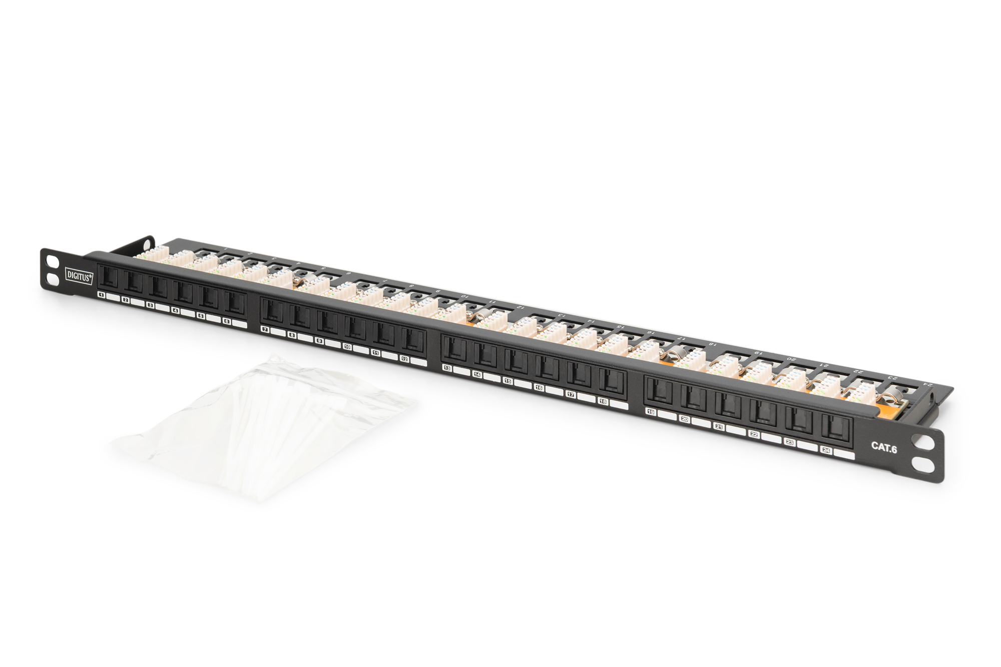 CAT 6 Patch Panel,ungeschirmt,24-Port RJ45 mit Klappen, 8P8C, LSA, 0,5HE, 19″ Rack Mount, sw
