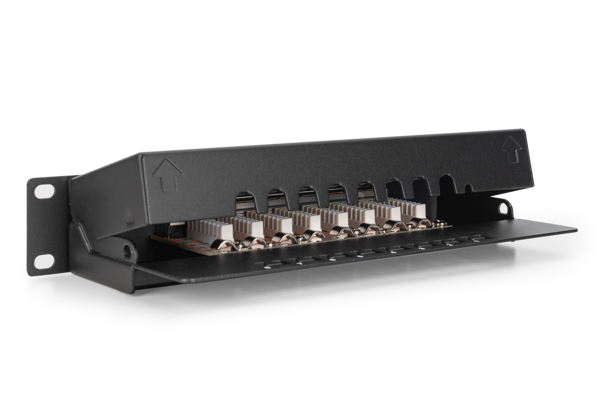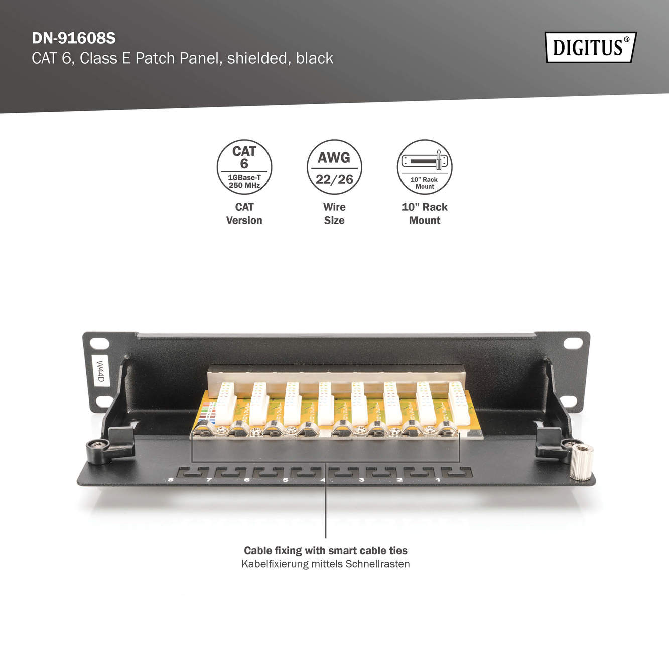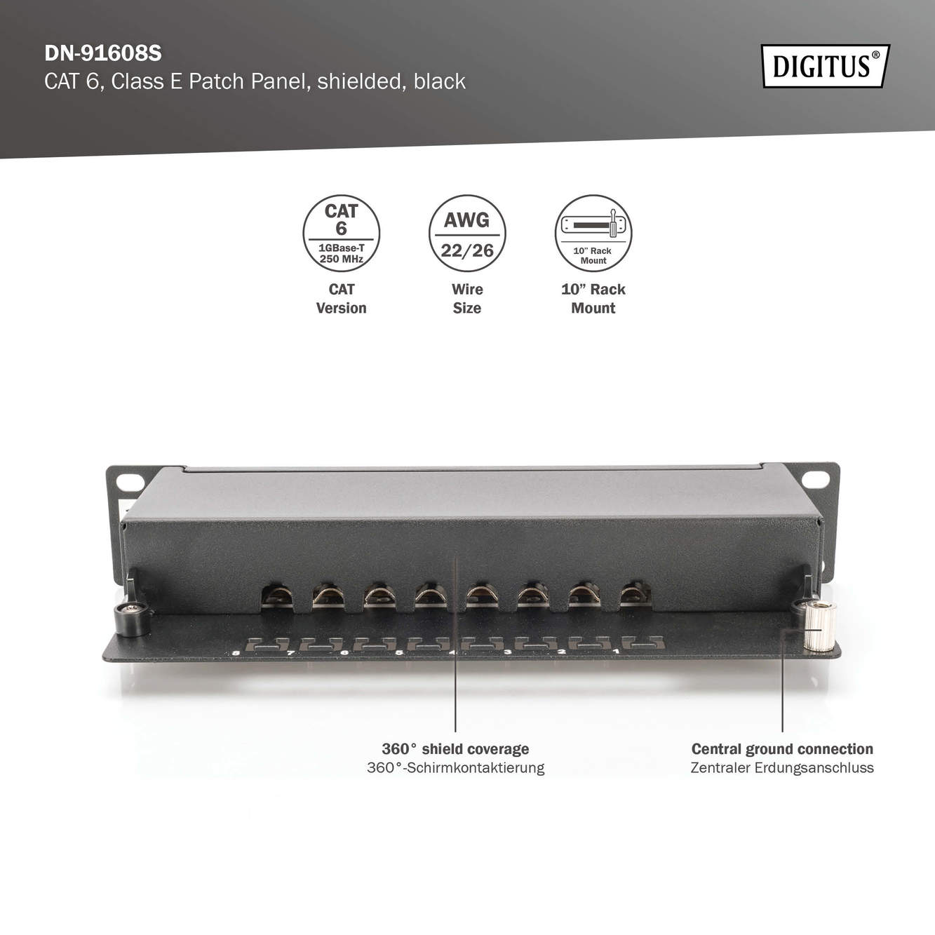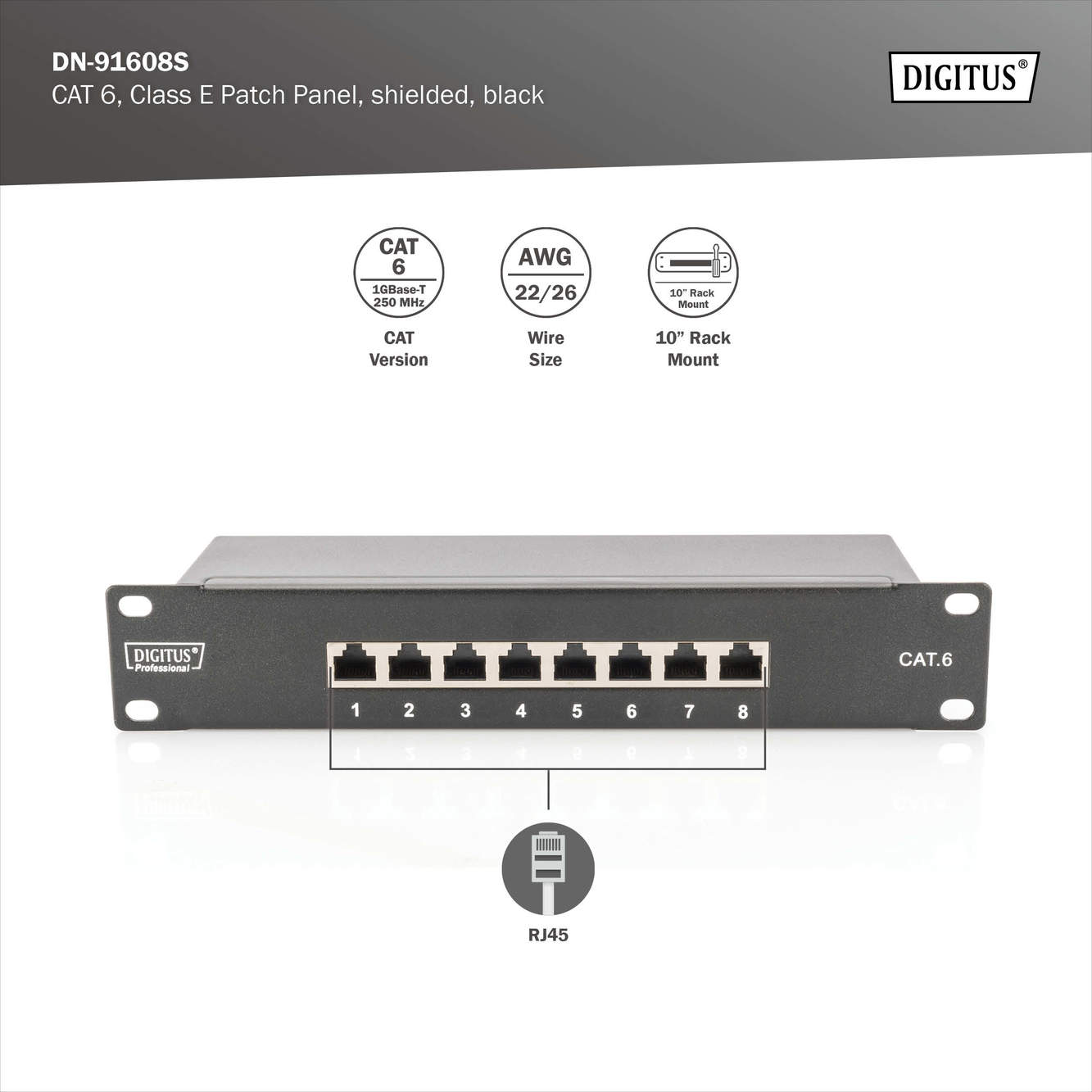 CAT 6, Klasse E Patch Panel,geschirmt,8-Port RJ45 8P8C, LSA, 1HE, 254 mm(10″)Rack Mount, schwarz