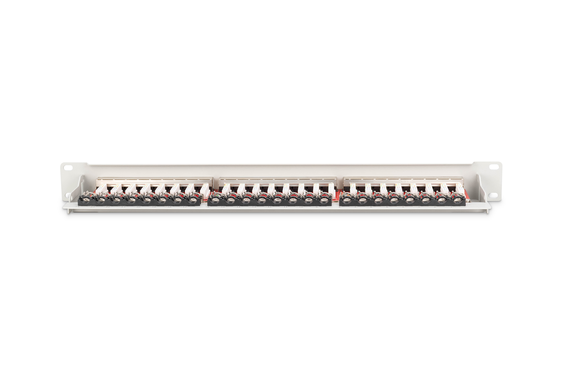 CAT 6A Patch Panel, geschirmt,1HE, 24-Port, 8P8C, RAL 7035, 483 mm (19″), Grau RAL 7035