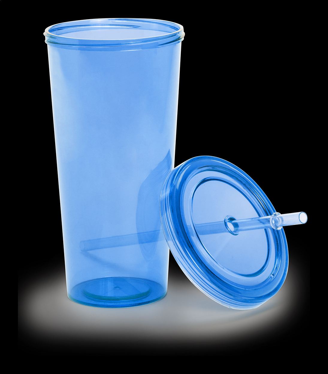 Farbig transparenter Trinkbecher aus Kunststoff mit Trinkhalm. Füllmenge: 750 ml.
