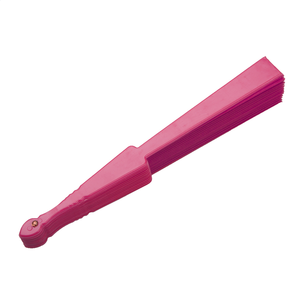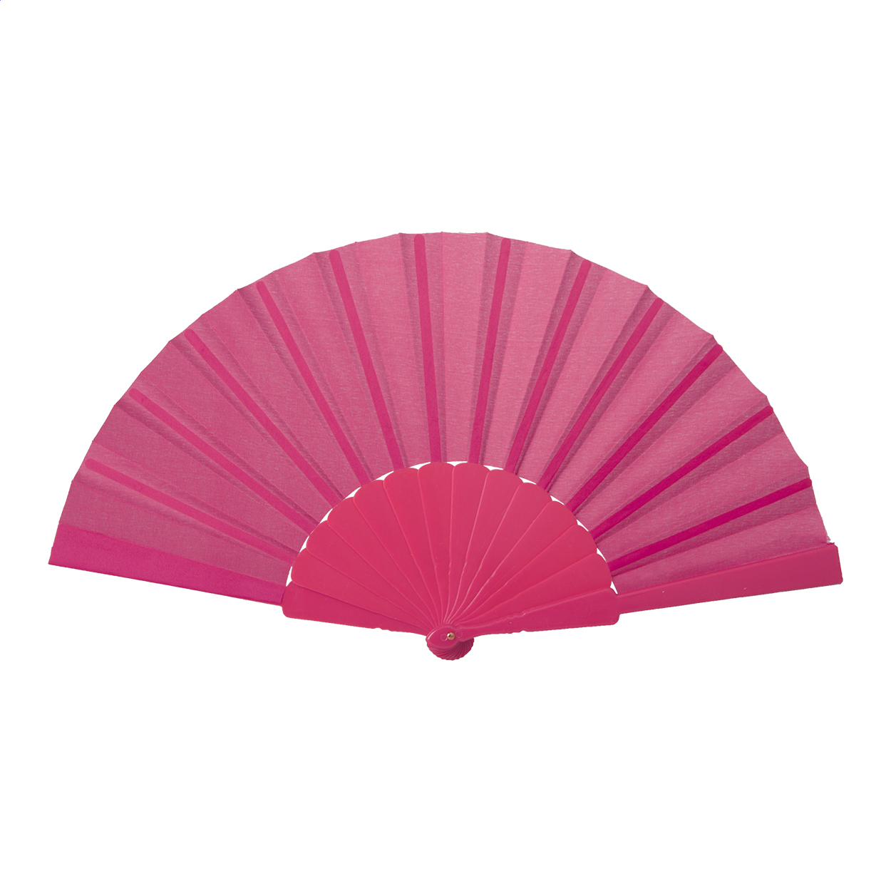 Fächer aus Stoff mit Griff aus Kunststoff.