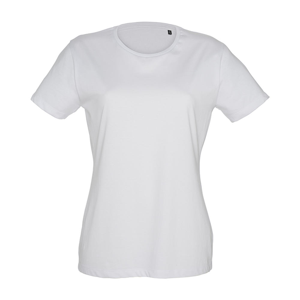 Damen-T-Shirt aus 145 g/m2 gekämmter Baumwolle. Gerippter doppellagiger Kragen mit Doppelnähten, Verstärkungsband am Hals, Struktur mit Seitennähten