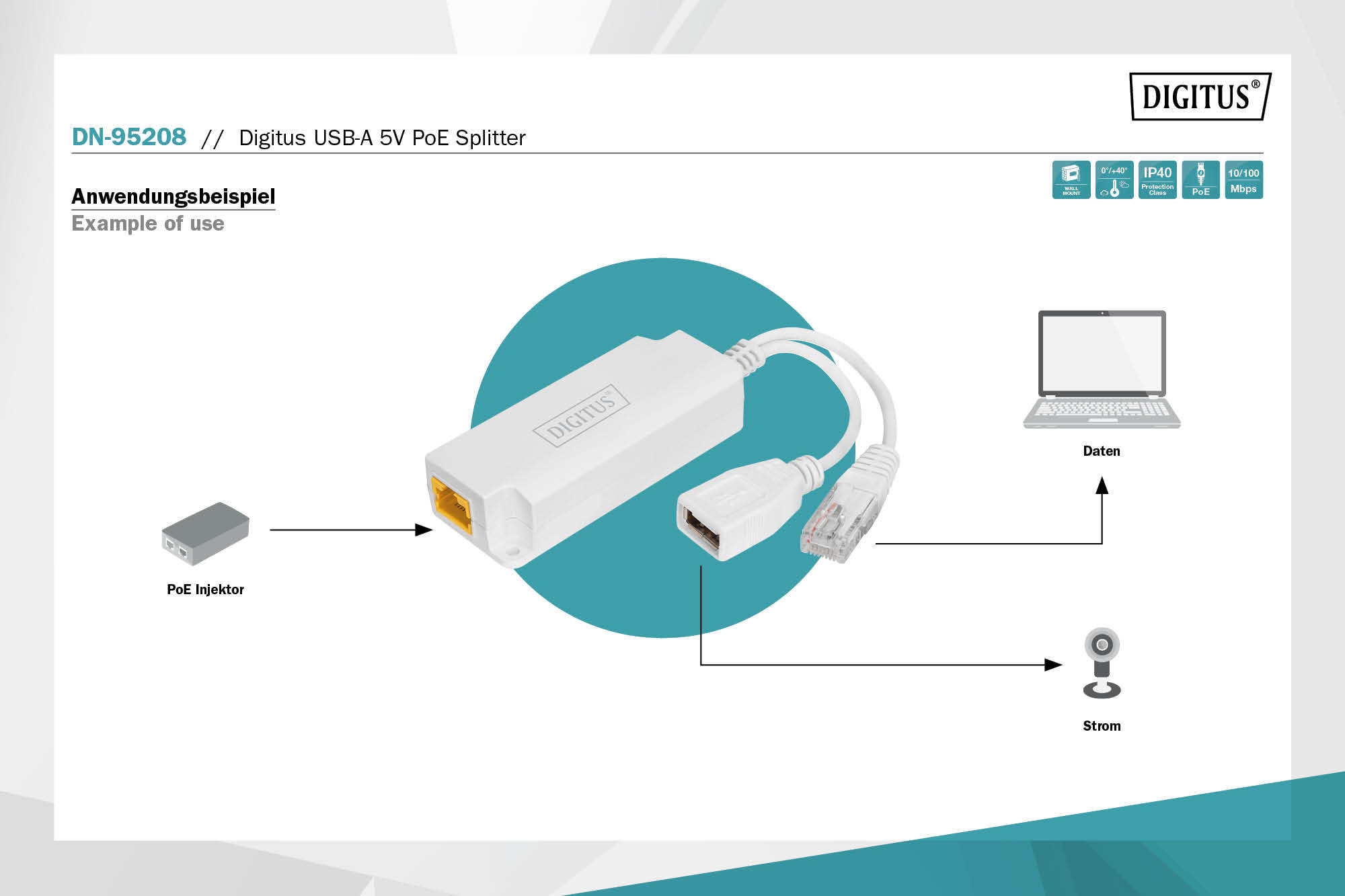 Gigabit USB-A PoE Splitter USB Typ A Female