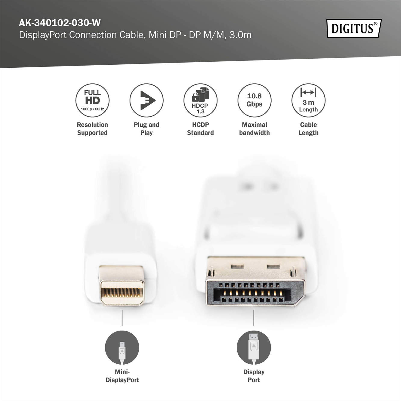 DisplayPort Anschlusskabel,Typ mini DP – DP St/St, 3.0m, m/Verrieg, Full HD, DP 1.1a konf., we