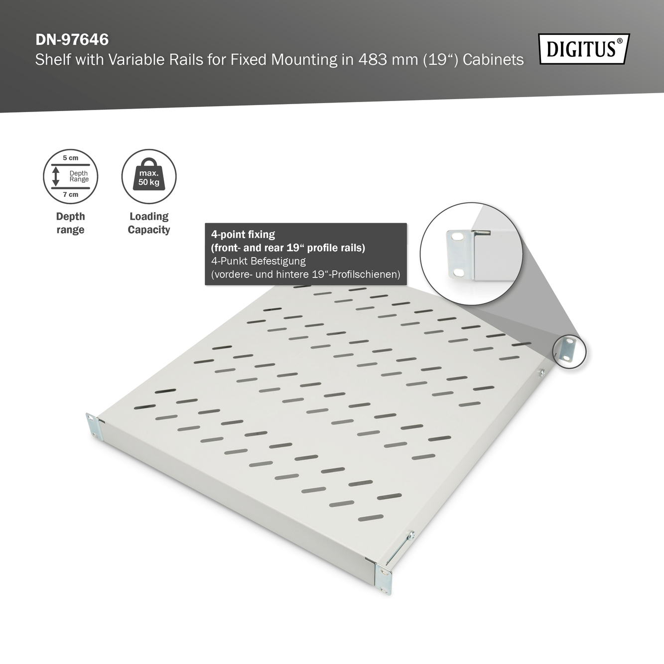 1HE Fachboden festeinbau für 800 mm tiefe Schränke 43x484x508 mm, einst. bis 700 mm Tiefe, grau