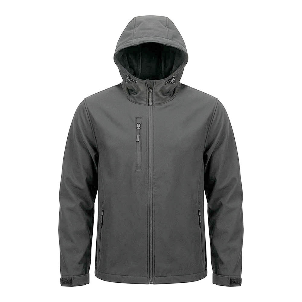 Unisex-Softshelljacke aus 280 g/m2 regeneriertem Material (98 % recyceltes Polyester, 2 % Elasthan). Verstellbare Kapuze mit Kordelzug und verstellbare Klettverschlüsse an den Ärmelbündchen. Eine Fronttasche und zwei seitliche Reißverschlusstaschen, Seitennähte