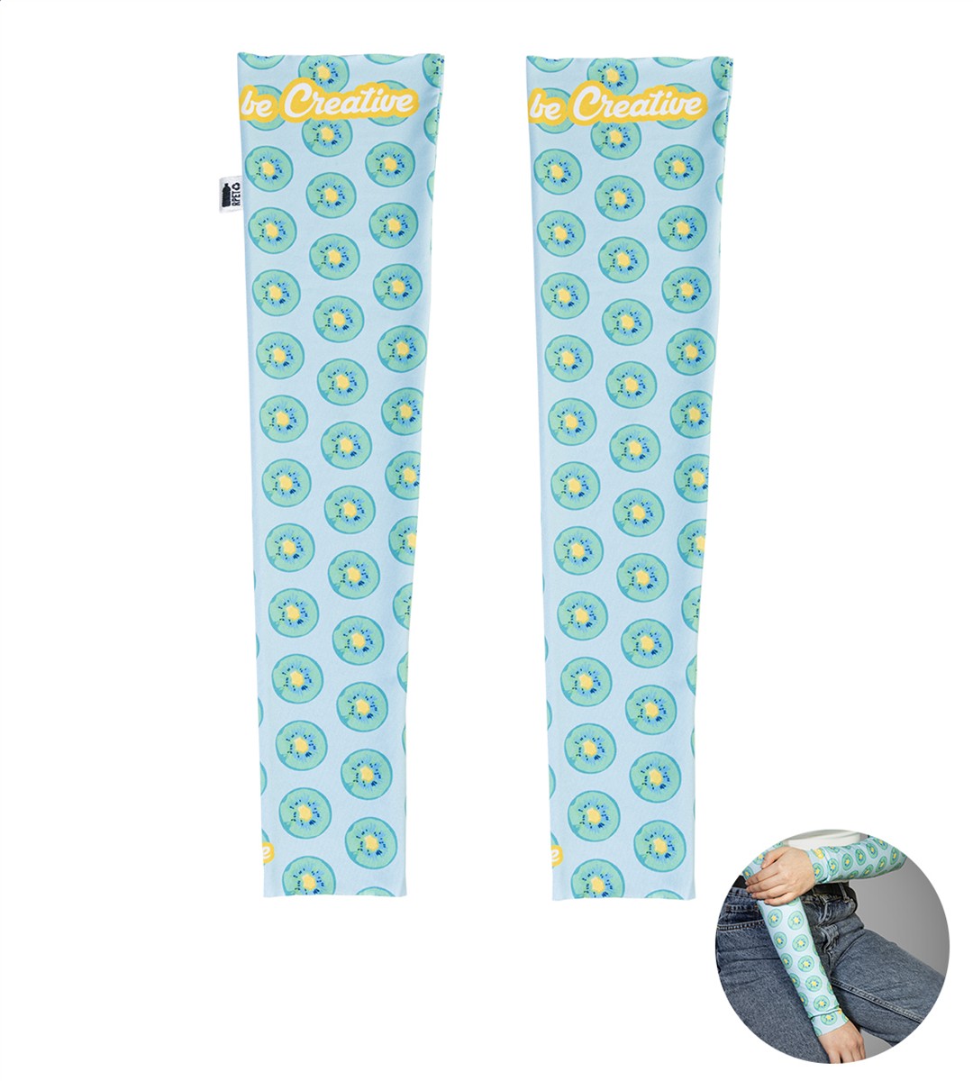 Ein Paar individuelle, elastische RPET-Armstulpen. Der Preis ist inkl. Sublimationsdruck. Material: 92 % RPET-Polyester und 8 % Elastan (185 g/m²). Mit Label RPET. Mindestmenge: 50 Stk. Größen: M (8x12x48 cm), L (9,5×13,5×52 cm).
