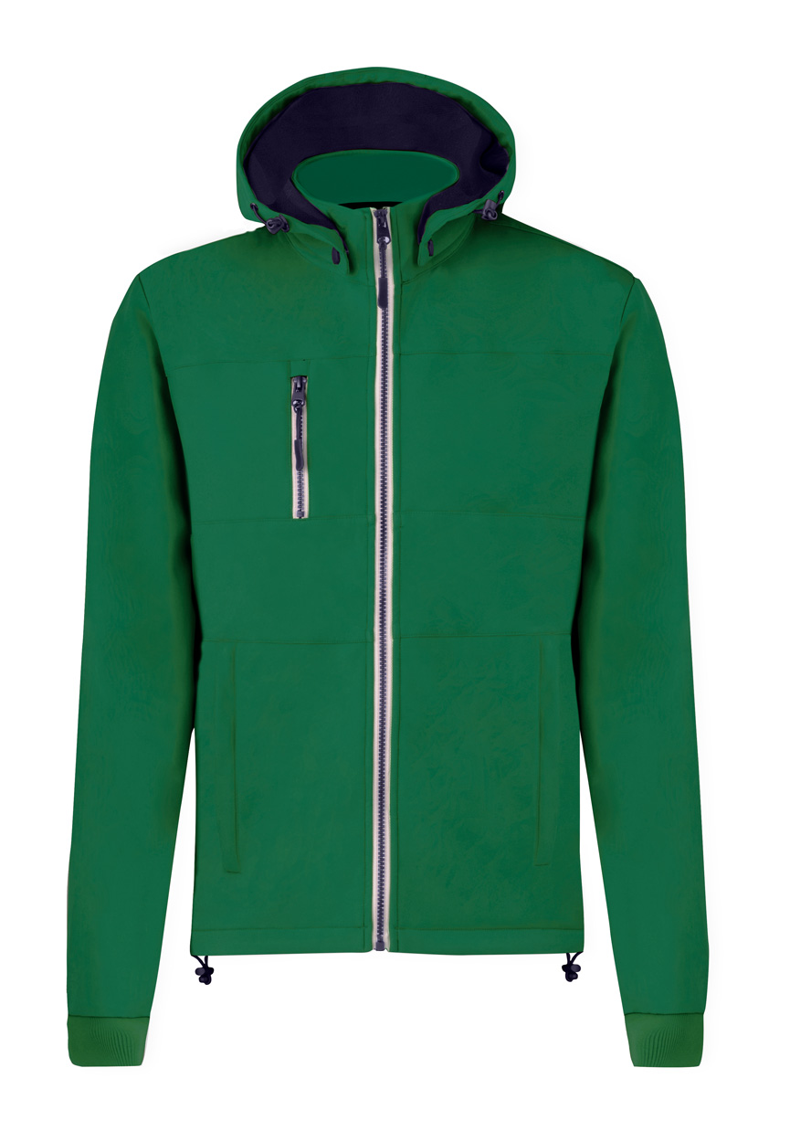 Wind- und wasserfeste Softshell-Jacke mit Reißverschluss, 2 Seitentaschen, 1 Vordertasche, Stehkragen und abnehbarer Kapuze. Material: 100% Polyester, 300g/m².