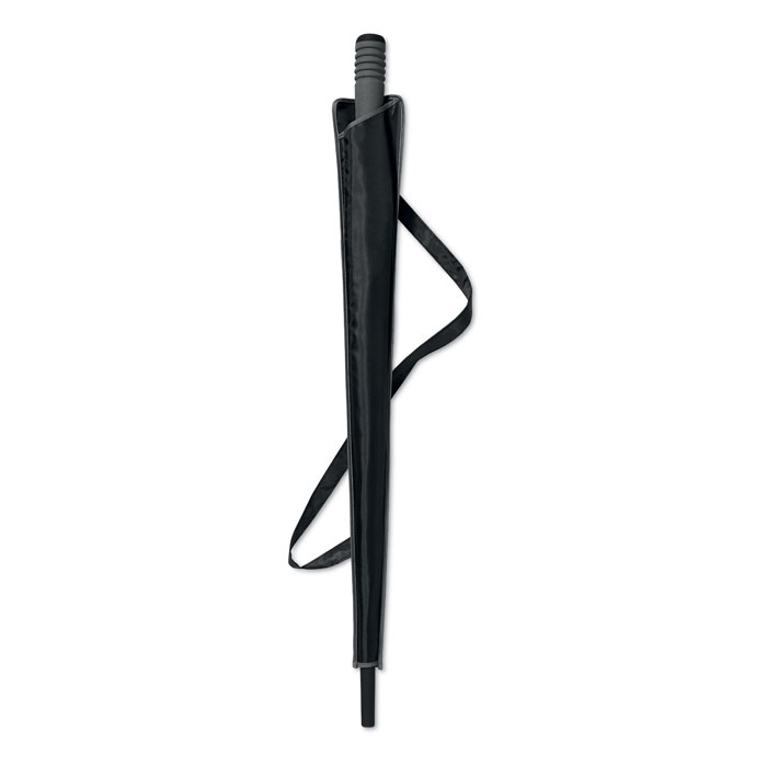 23” Regenschirm aus 190T Polyester. Stock, Stangen und Spitzen aus verzinktem Metall. Schwarz gummierte Krone aus Kunststoff. Farbige Segmente mit grauen Absetzungen. Grauer Griff aus EVA. Passende Schirmhülle. Automatische Öffnung, manuelle Schließung.