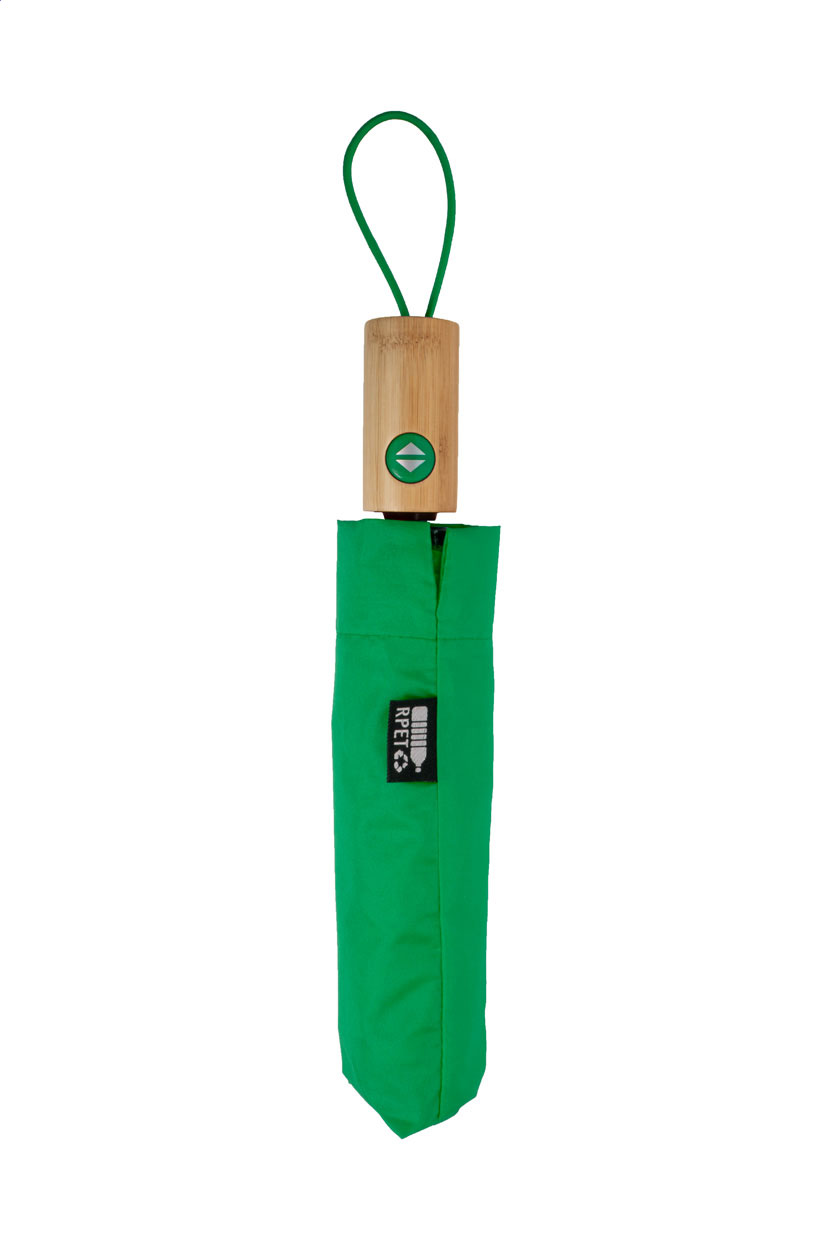 Vollautomatischer (öffnen/schließen), Windproof-Taschenschirm mit 8 Segmenten, mit Metallrahmen, Fiberglasschienen und Bambusgriff. In farblich passender Tasche. Material: 190T RPET. Mit RPET-Label.