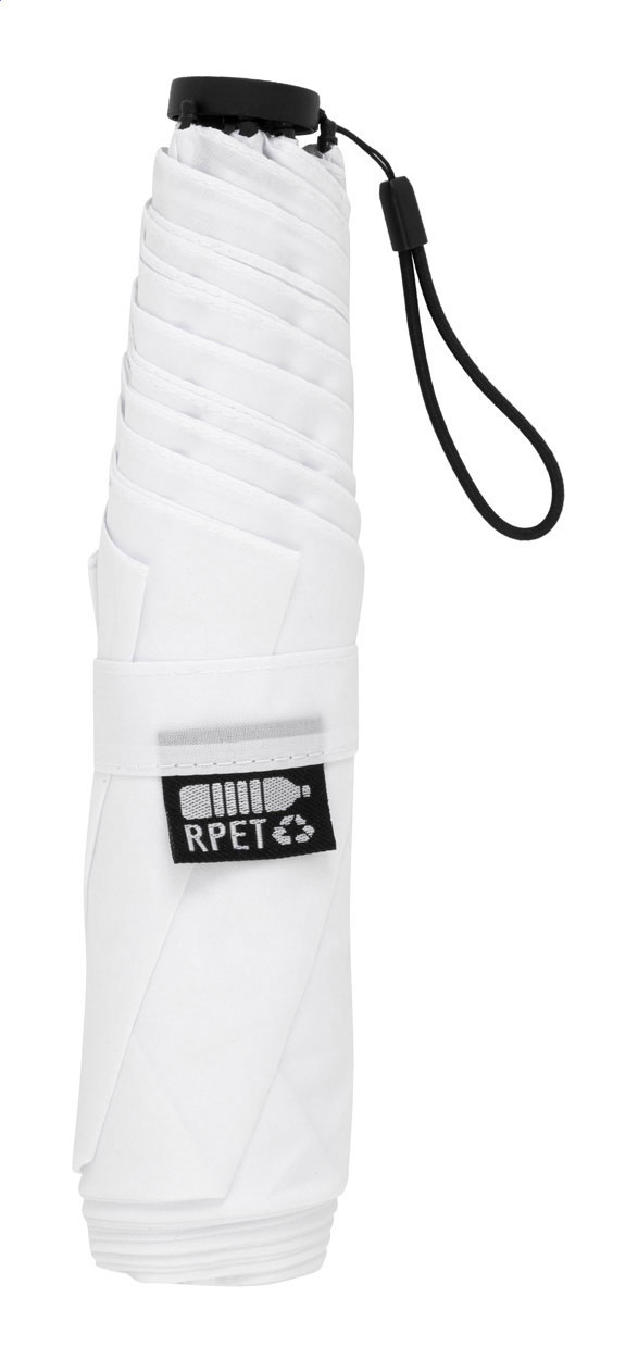 Manueller, ultraleichter (130 g) Windproof-Mini-Taschenschirm, 3-fach faltbar, mit 6 Segmenten in farblich abgestimmten Etui. Rahmen aus Metall, Speichen aus Fiberglaus, kompakter Griff mit Handschlaufe und Bespannung aus 190T RPET Pongee. Mit RPET-Label.
