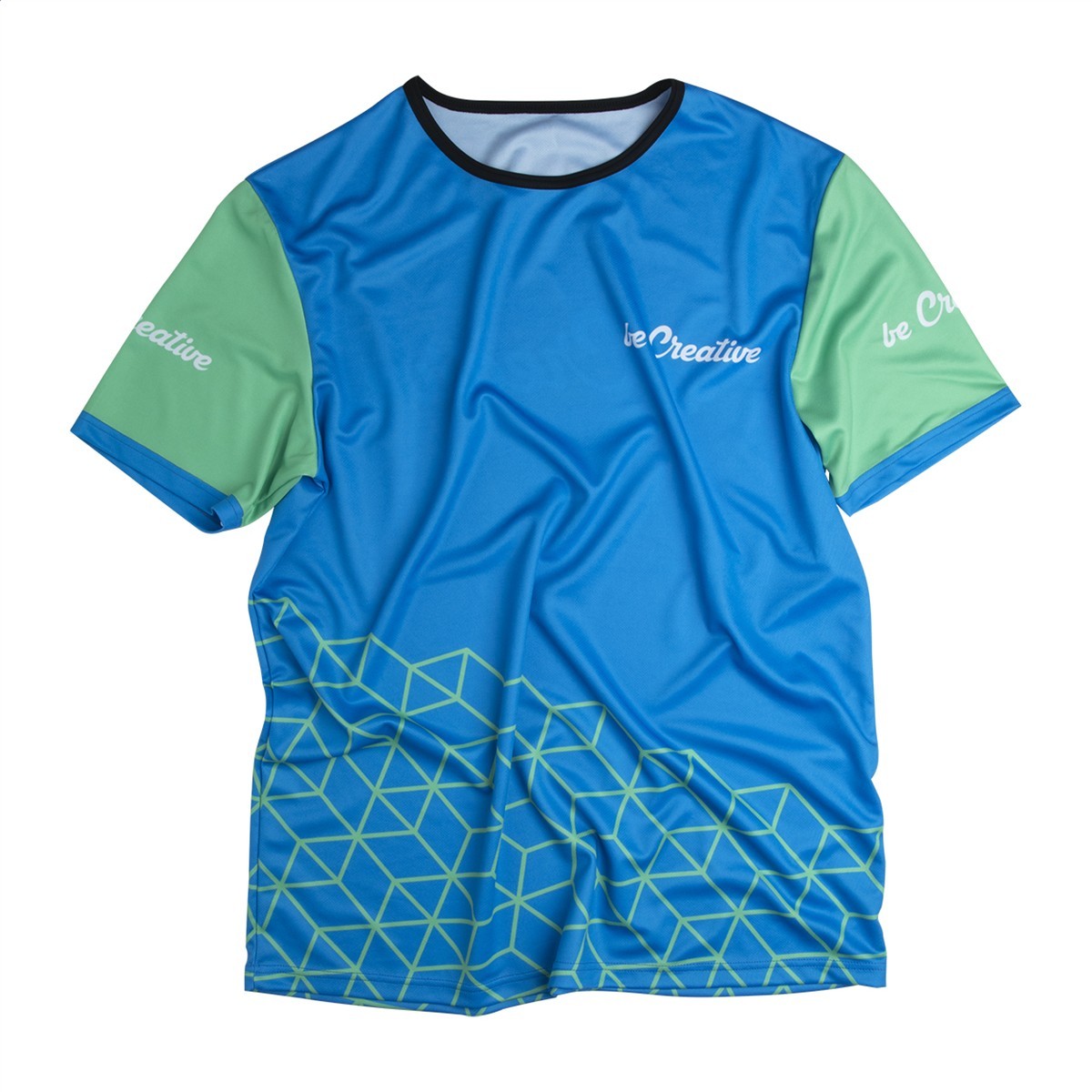 Individuelles, atmungsaktives Sport-T-Shirt mit All-Over-Sublimationsdruck. Material: 100% Polyester (140g/m²). Mindestmenge: 10 Stk. je Größe.