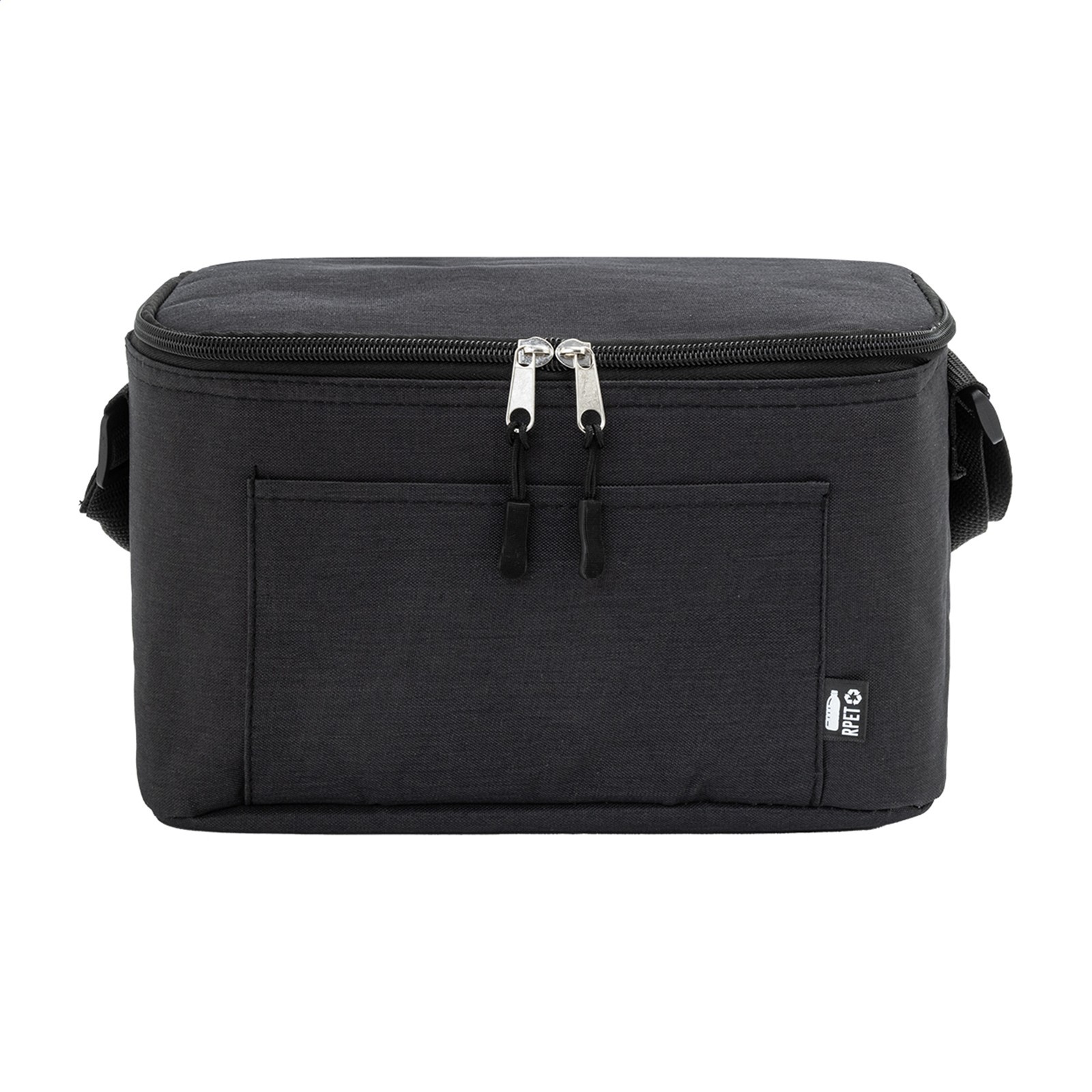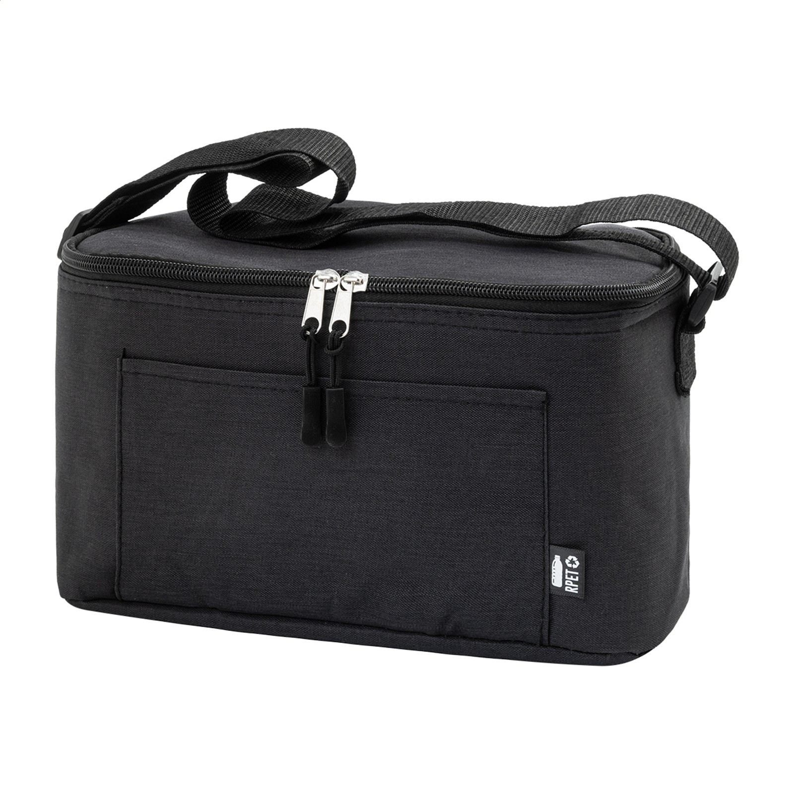 Kühltasche mit Reißverschluss aus RPET mit Aluminiumpolsterung, für 6 Dosen 0,33 L. Mit Fronttasche und verstellbarem Schultergurt. Material: 600D RPET Polyester. Mit RPET-Label.