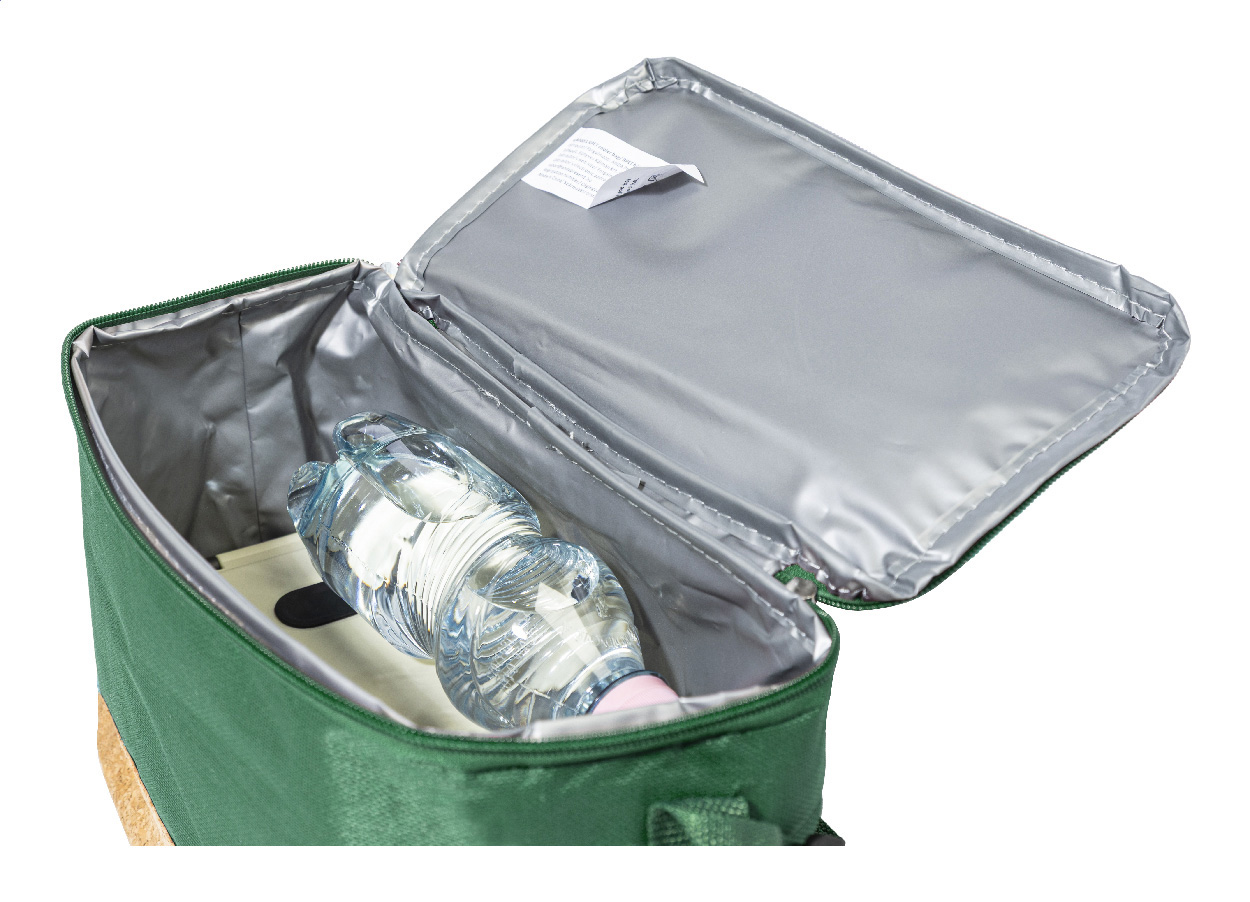 600D RPET-Polyester-Kühltasche mit Reißverschluss, Boden aus Naturkork, PEVA-Polsterung und verstellbarem Schultergurt. Mit RPET-Label.