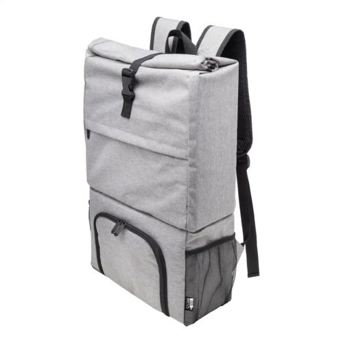 Rolltop RPET-Kühlrucksack mit gepolstertem PEVA-Kühlfach mit Reißverschluss für die Lunchbox. Hauptfach mit Schnallenverschluss, Vordertasche mit Reißverschluss, mit seitlichen Netztaschen und gepolsterten Schulterriemen. Material: 600D RPET-Polyester. Mit RPET-Label.