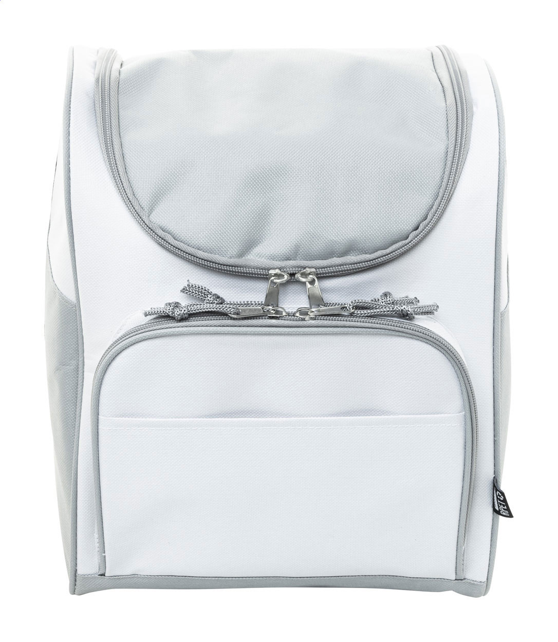 RPET-Kühltasche mit Aluminium-Polsterung. Mit 2 Reißverschlussfächern, kleiner Fronttasche und verstellbarem Schultergurt. Material: 600D RPET-Polyester. Mit RPET-Label.