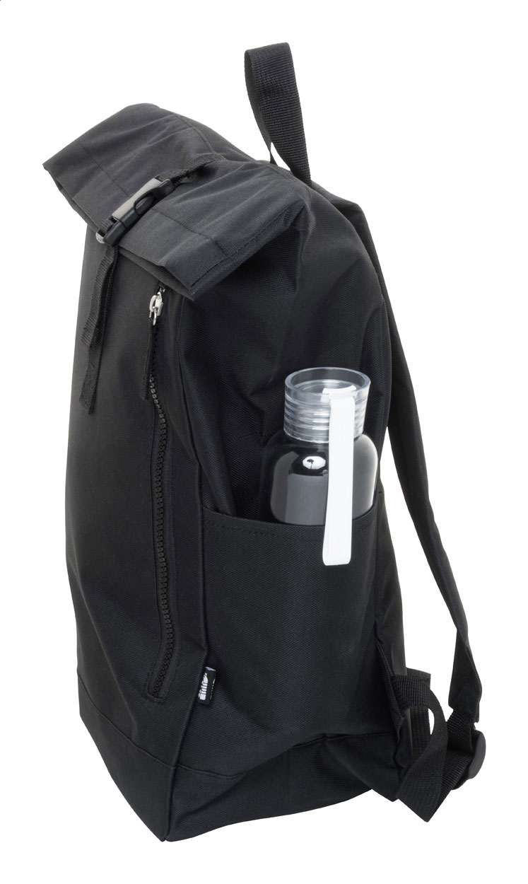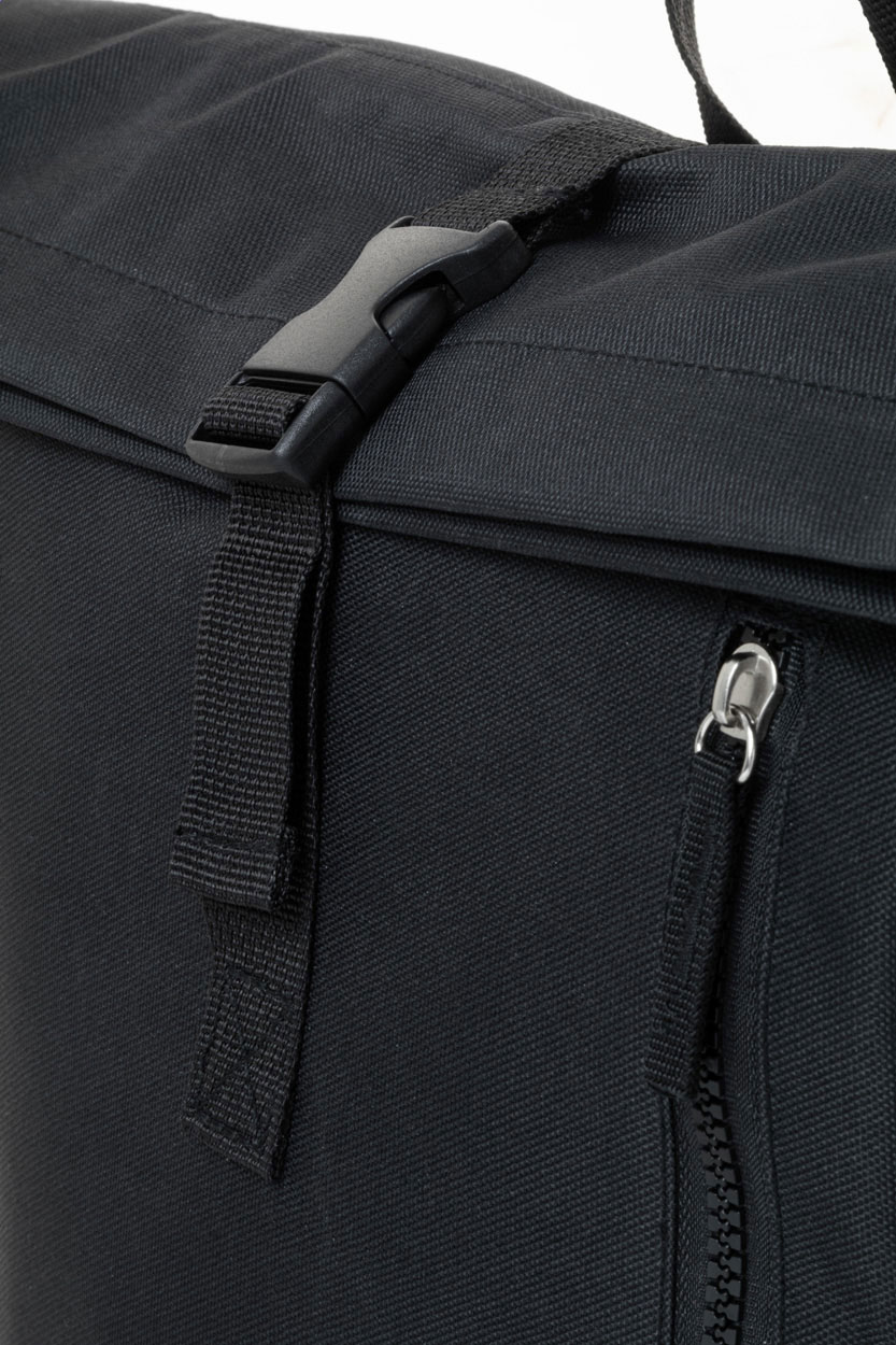 RPET-Rolltop-Rucksack mit Schnallenverschluss, Laptopfach (14″) und Reißverschluss-Fronttasche. Mit gepolstertem Rücken und Schultergurten. Material: 600D RPET-Polyester. Mit RPET-Label.