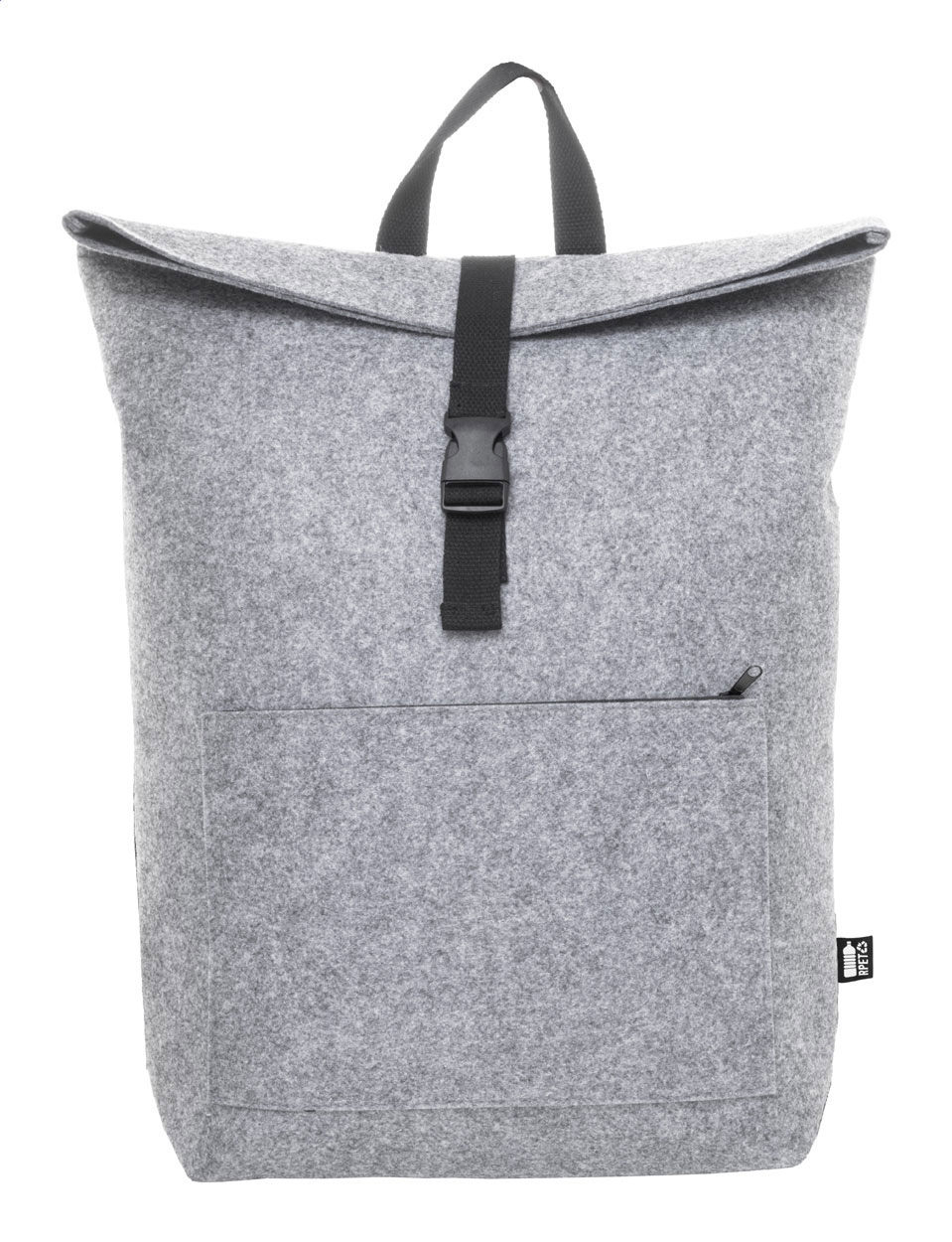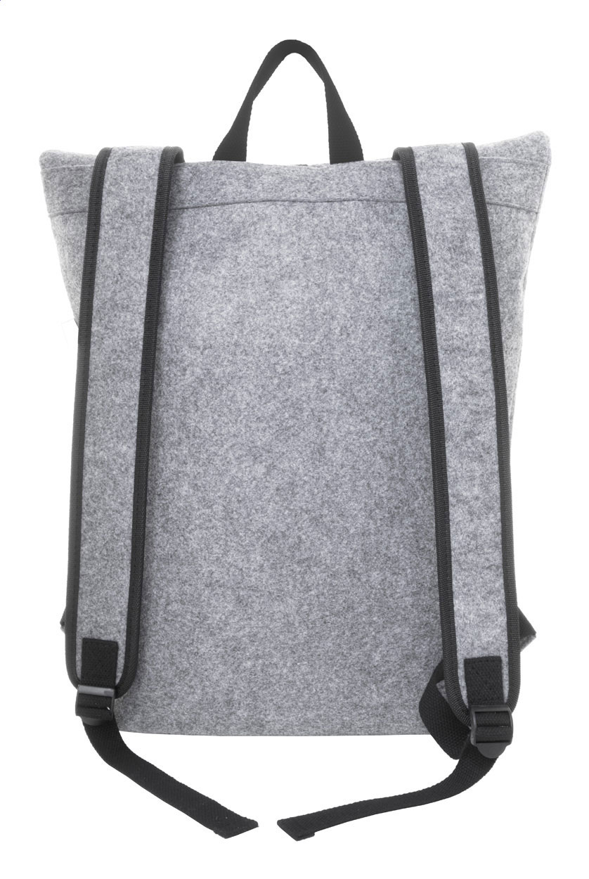 Rolltop-Rucksack aus RPET Filz mit Schnallenverschluss am Hauptfach, Reißverschluss-Fronttasche, Laptopfach (15″) und gepolsterten Schultergurten. Mit RPET-Label.