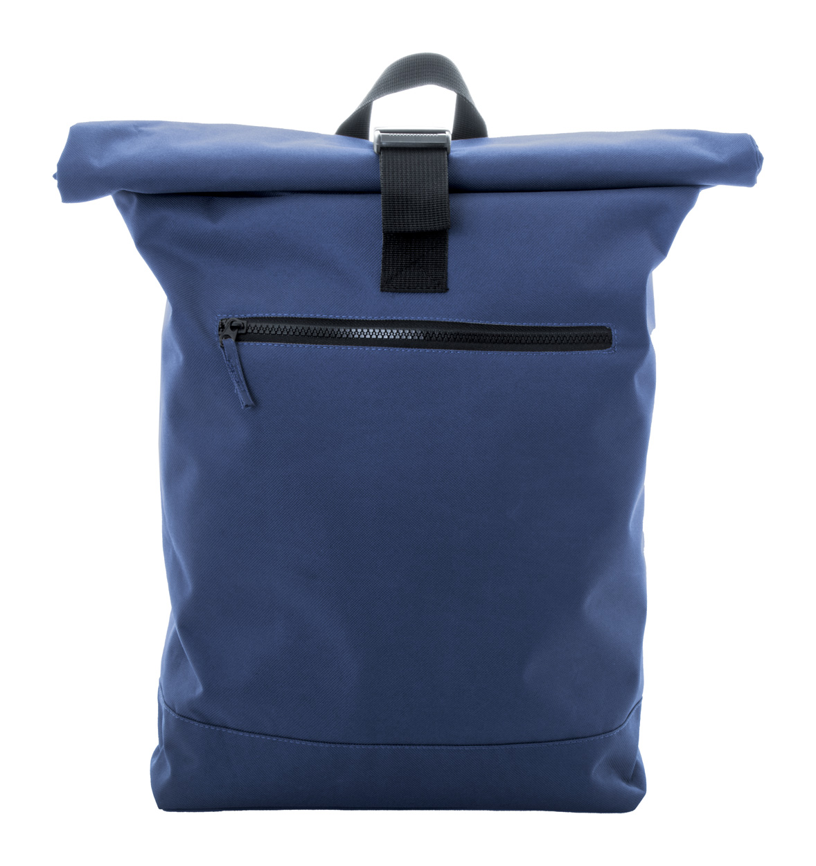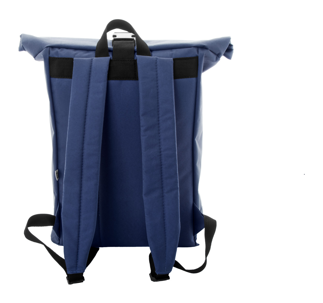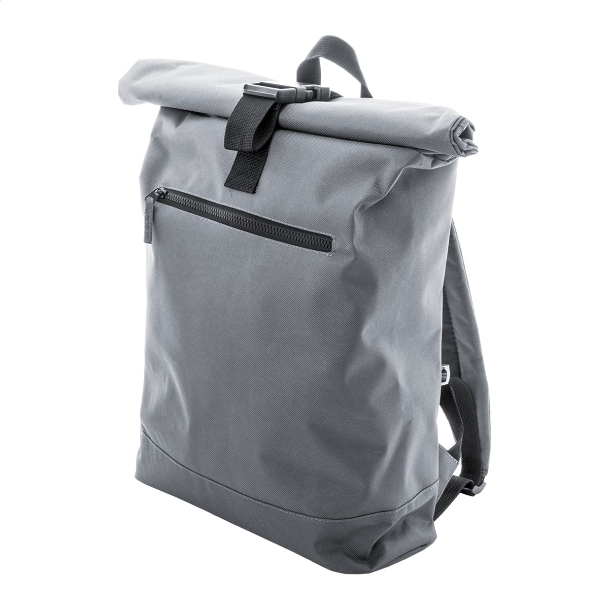 Rolltop-Rucksack aus RPET mit Schnallenverschluss, gepolstertem Laptopfach (16″), Reißverschlusstasche vorne, Seitentaschen, gepolstertem Rücken und Schultergurten. Material: 600D RPET-Polyester. Mit RPET-Label.