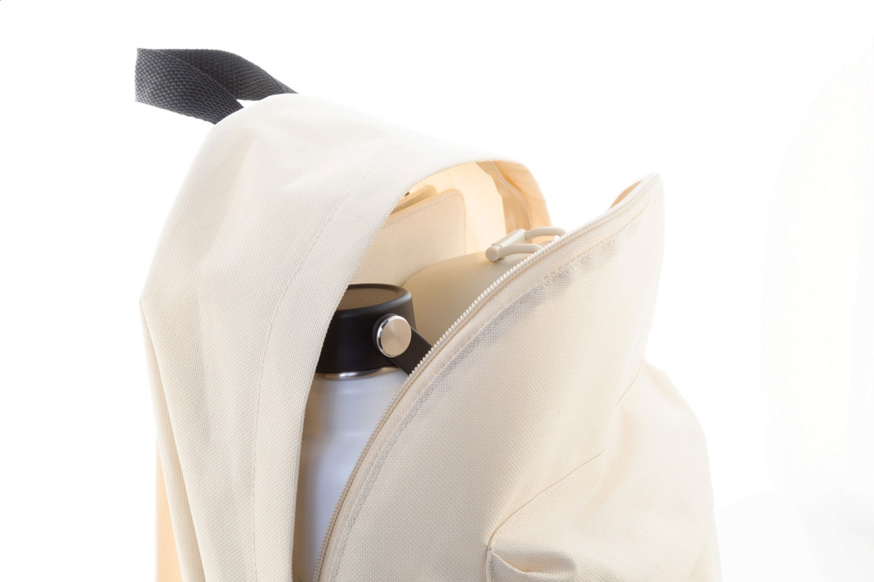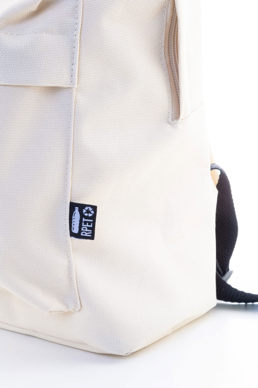 RPET-Rucksack mit Reißverschluss-Hauptfach, Reißverschluss-Vortasche, gepolstertem Rücken und Schultergurten. Material: 600D RPET-Polyester. Mit RPET-Label.