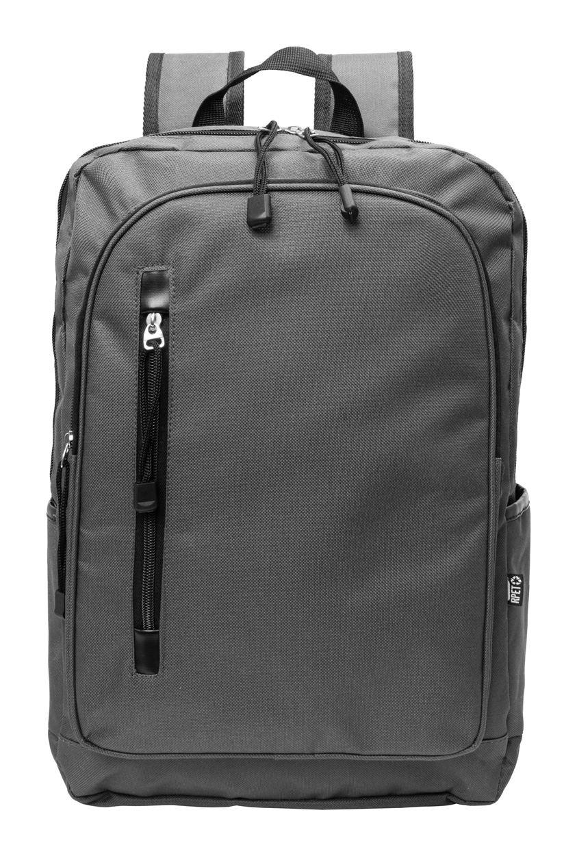 RPET-Rucksack mit Reißverschluss-Hauptfach, 2 Reißverschlusstaschen vorne, Seitentaschen und gepolstertem Laptopfach (15″). Mit gepolstertem Rücken und Schultergurten. Material: 600D RPET-Polyester. Mit RPET-Label.