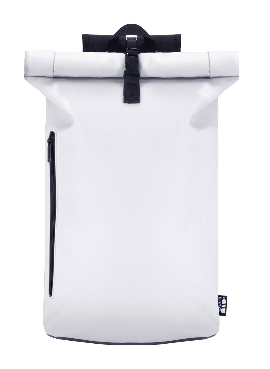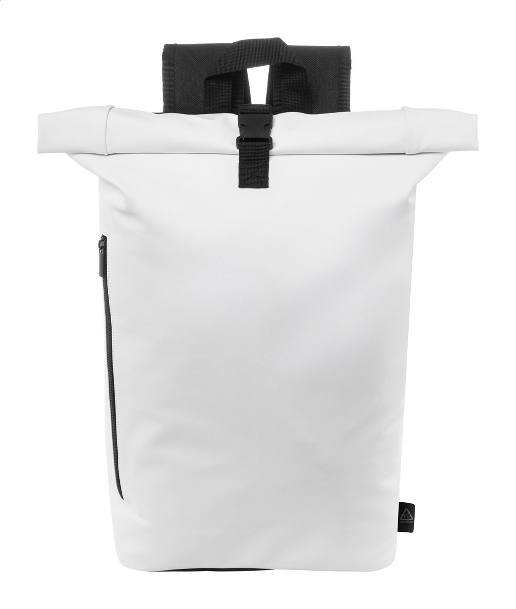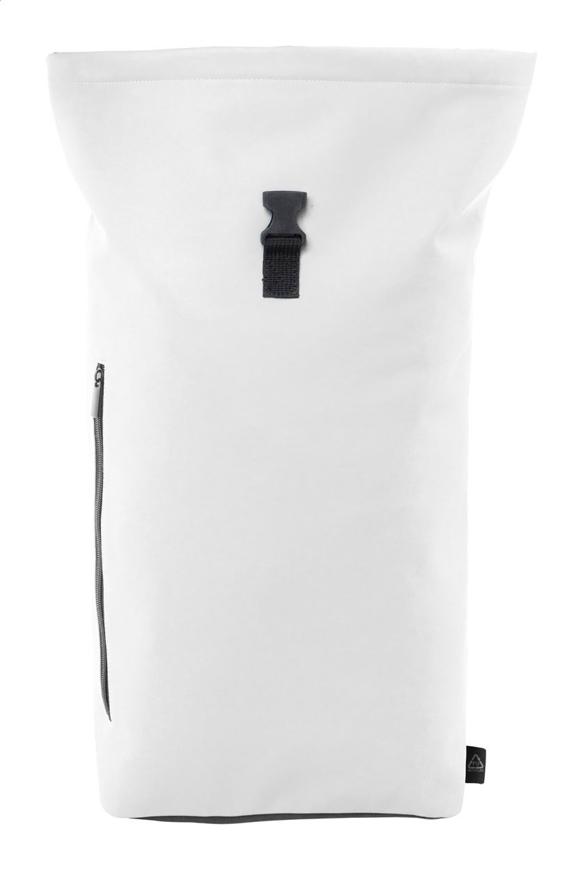 Wasserdichter, weicher Rolltop-Rucksack aus recyceltem PU-Leder mit Schnallenverschluss, Vordertasche mit Reißverschluss und gepolstertem Laptopfach (15″). Mit gepolstertem Rücken und Schultergurten. Mit Label recyceltes PU.