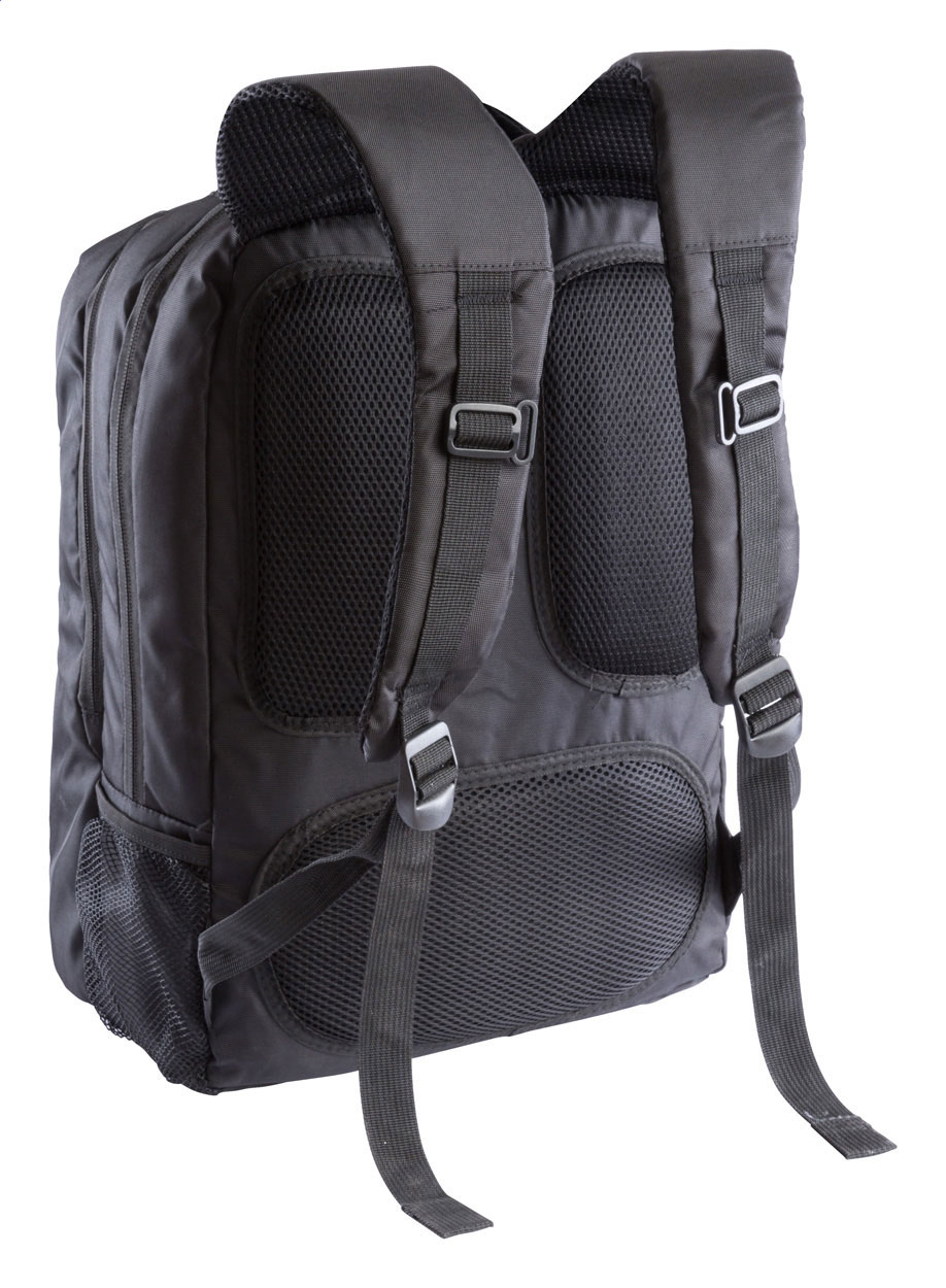 Rucksack mit mehreren Reißverschlusstaschen, gepolstertem Laptopfach (15″), Rückenpartie und Schultergurten. Material: 600D Nylon.