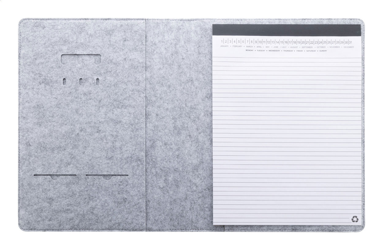 Dokumentenmappe im A4-Format aus RPET-Filz mit einer Fronttasche und mehreren Organizerfächern innen. Enthält einen Notizblock mit 20 linierten Seiten aus recyceltem Papier.