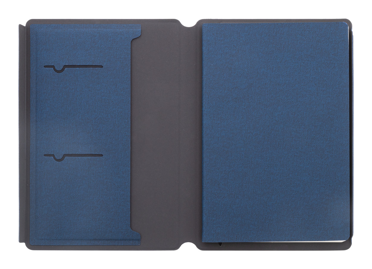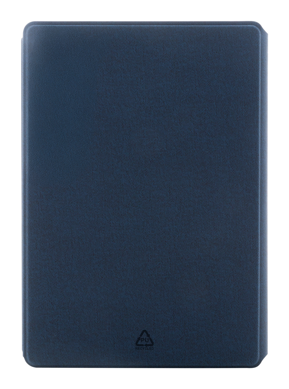 Dokumentenmappe im A5-Format aus recyceltem Kunstleder mit Organizerfächern innen und Magnetverschluss. Enthält einen Notizblock mit 64 linierten Seiten aus recyceltem Papier.