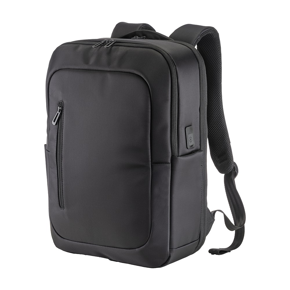 Laptop-Rucksack (15) aus 210D Polyester. Fronttasche mit Reißverschluss. Großes Hauptfach und Seitentaschen für Flaschen. USB-Buchse. Gepolsterte Rücken- und Schultergurte mit atmungsaktivem Material. Trolley-Befestigungssystem