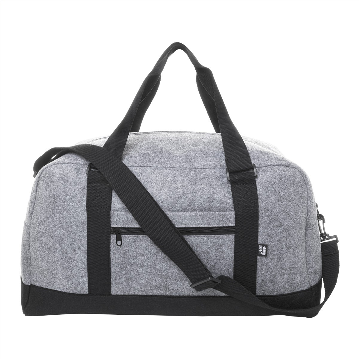 Zweifarbige Sporttasche aus RPET Filz mit Reißverschluss-Hauptfach und -Fronttasche sowie verstellbarem Schultergurt. Mit RPET-Label.