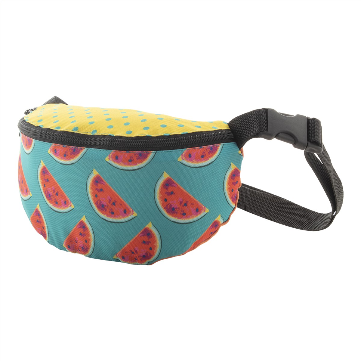 Individuelle Gürteltasche mit Reißverschlussfach, Material: 600D RPET Polyester. Der Preis ist inkl. vollflächigem Sublimationsdruck und RPET-Label. Mindestmenge: 25 Stk.