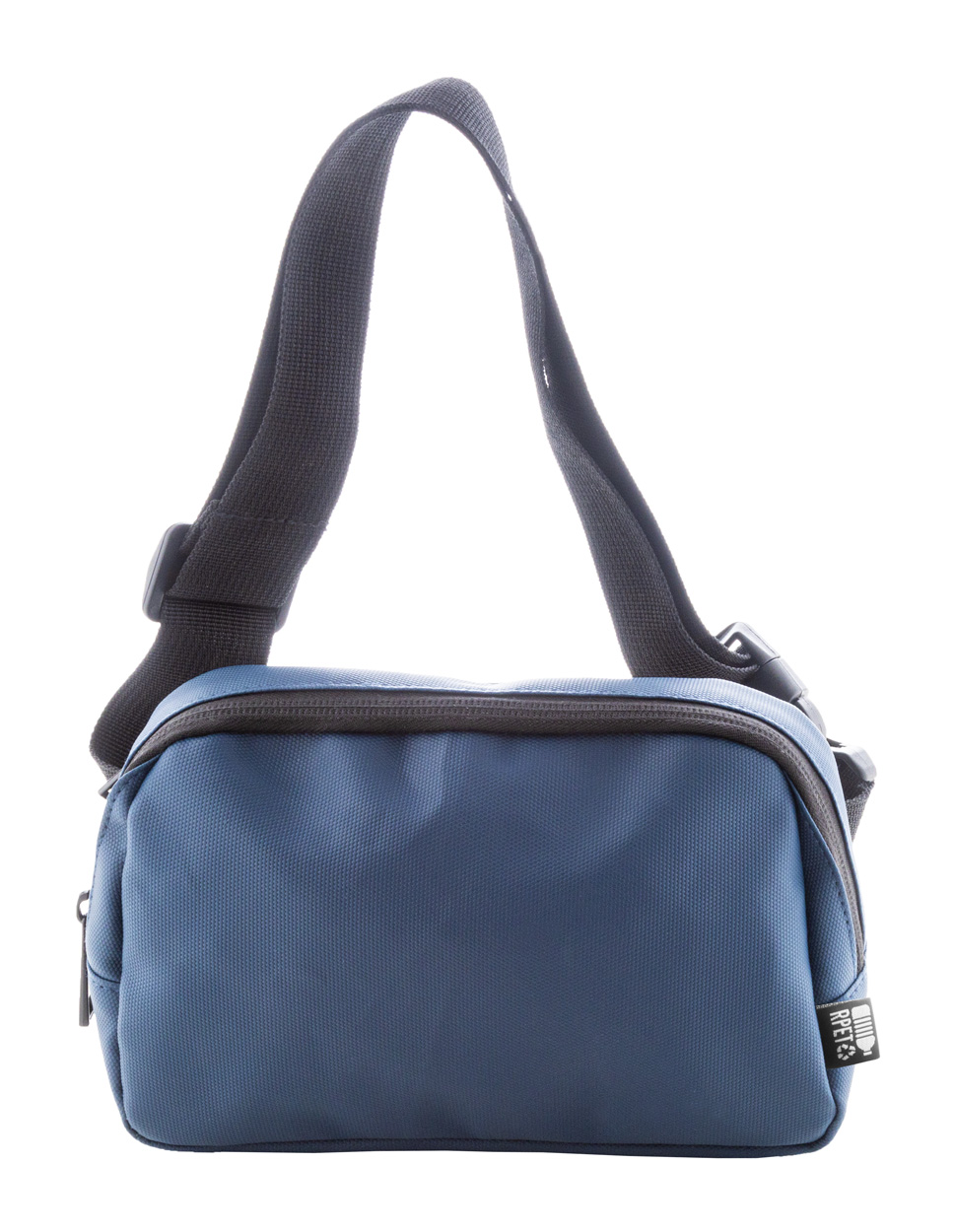 Wasserdichte RPET-Hüfttasche mit 2 Reißverschlussfächern, Netz-Innentaschen und verstellbarem Gurt. Material: PU-beschichtetes 600D RPET-Polyester. Mit RPET-Label.