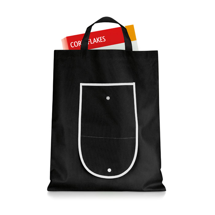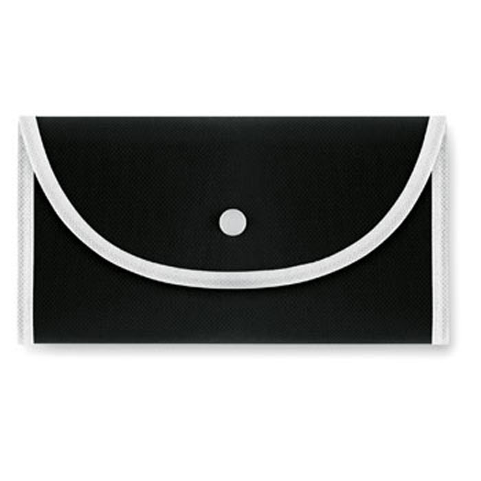 Faltbare Non Woven Tasche. Zusammengefaltet im Börsenformat mit Kunststoff-Druckknopf. Der Artikel wird ungefaltet geliefert. 70 g/m².