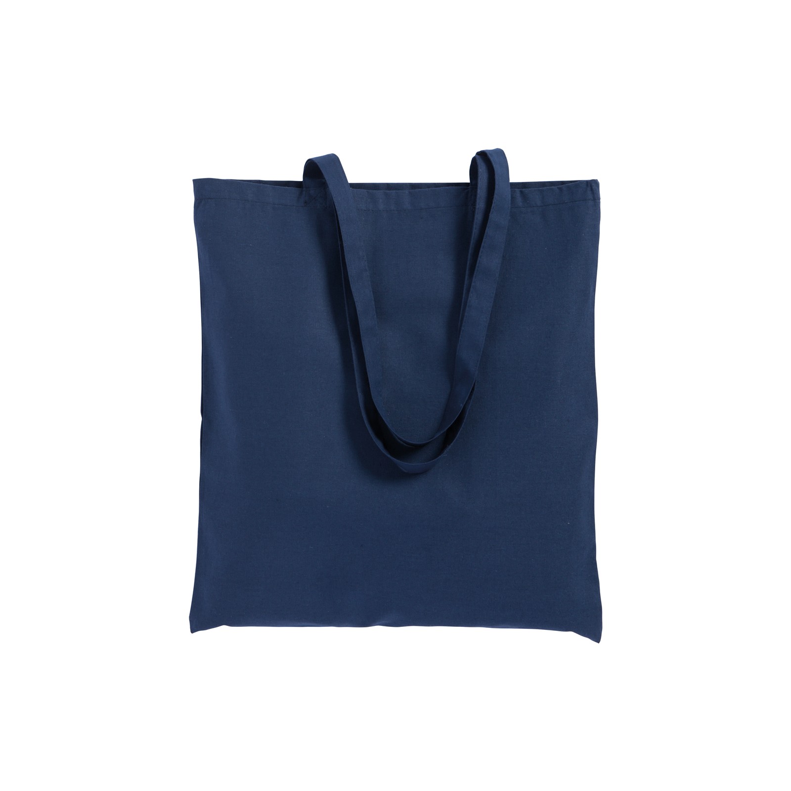 Shopper aus recycelter Baumwolle/Polyester 180 g/m2, lange Griffe. Bei dunklen Beuteln wird aufgrund des hohen Polyesteranteils empfohlen, für den Siebdruck Antisublimationstinte zu verwenden.
