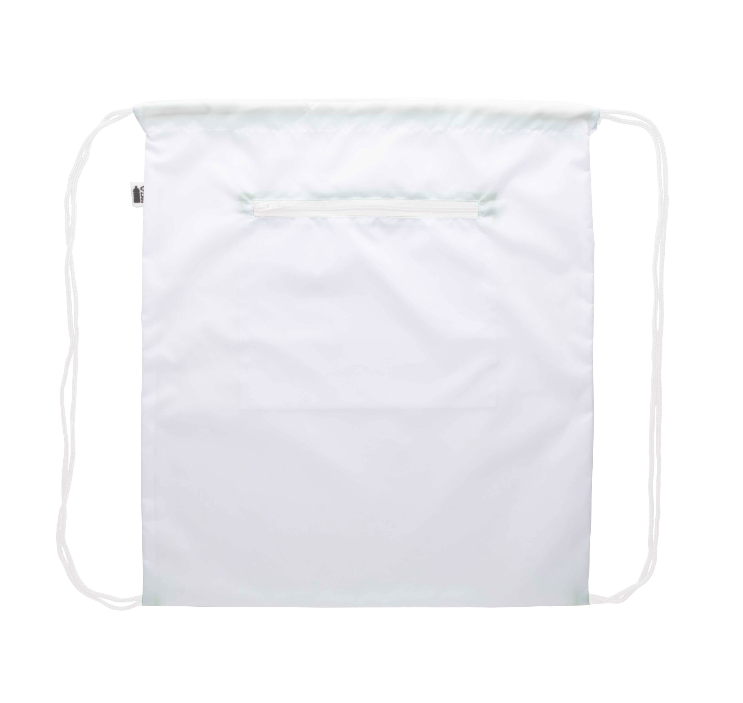 Individueller Turnbeutel mit Zugkordeln, mit Reißverschlusstasche vorne, Material: 190T RPET. Der Preis ist inkl. vollflächigem Sublimationsdruck. Mindestmenge: 25 Stk.
