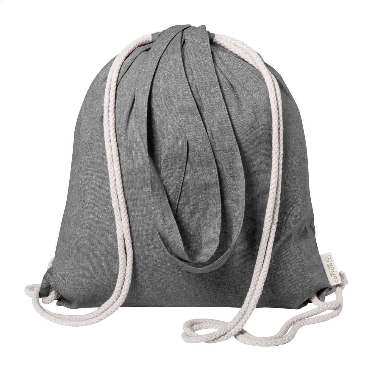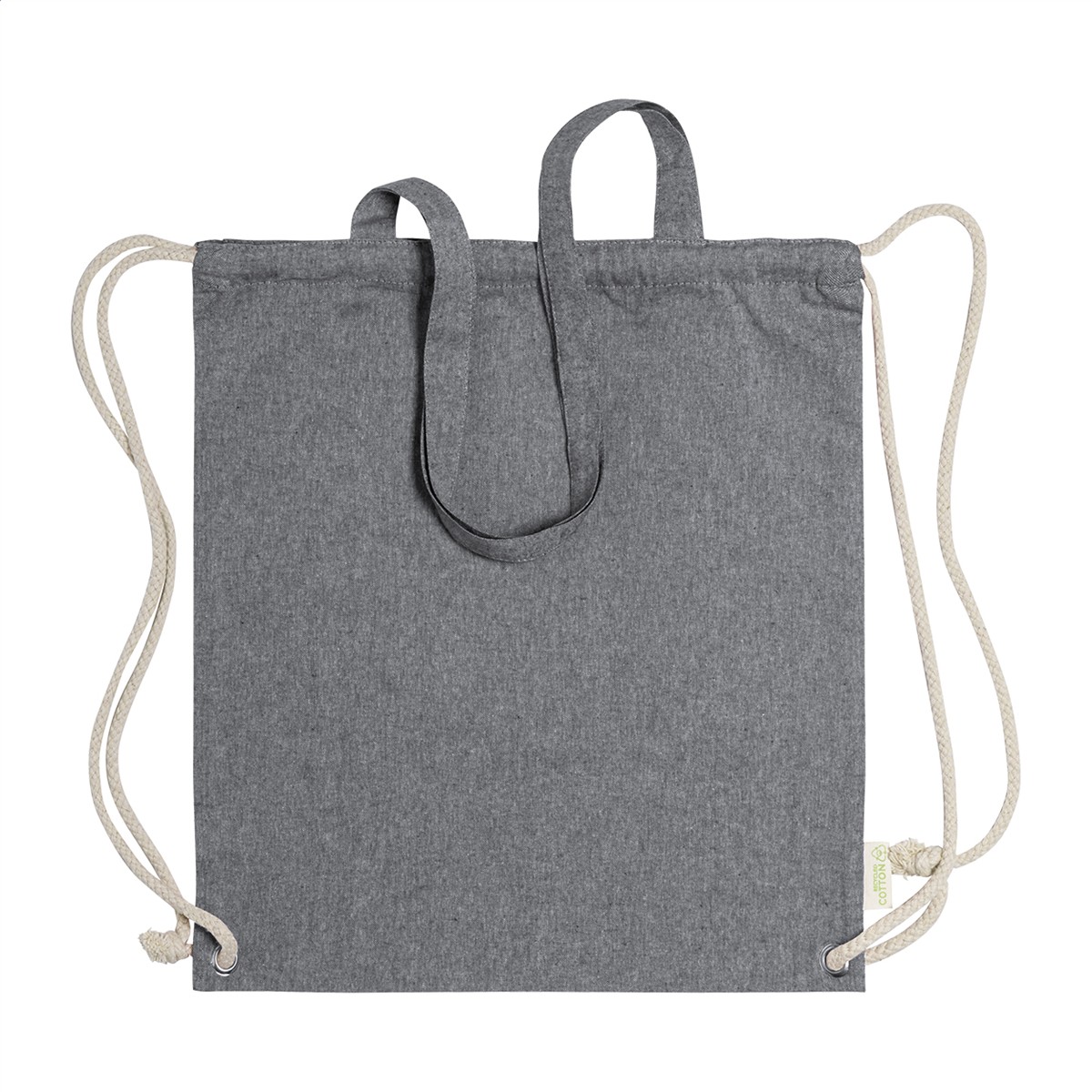 Turnbeutel aus recycelter Baumwolle mit dicken geflochtenen Kordeln und langen Griffen. Auch verwenbar als Einkaufstasche. Material: 100% recycelte Baumwolle (140 g/m²).