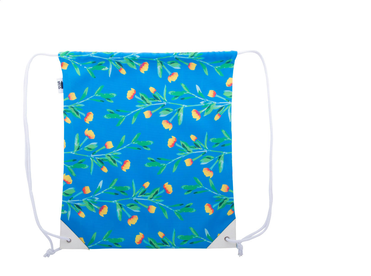Individueller Turnbeutel aus 600D RPET Polyester mit verstärkten Ecken aus Kunstleder und dicken, farblich abgestimmten Kordeln. Inklusive vollflächigem Sublimationsdruck und RPET-Label. Mindestmenge: 25 Stk.