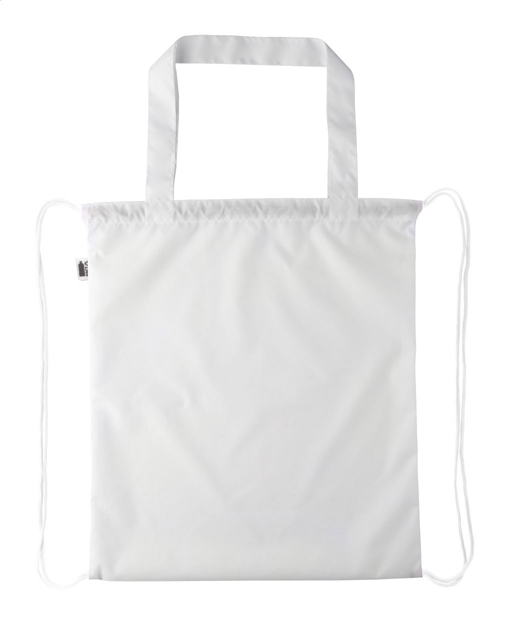 Individueller Turnbeutel mit farbigen Zugkordeln und langen Henkeln, Material: 190T RPET Polyester. Kann auch als Einkaufstasche verwendet werden. Der Preis ist inkl. vollflächigem Sublimationsdruck sowie RPET-Label. Mindestmenge: 25 Stk.