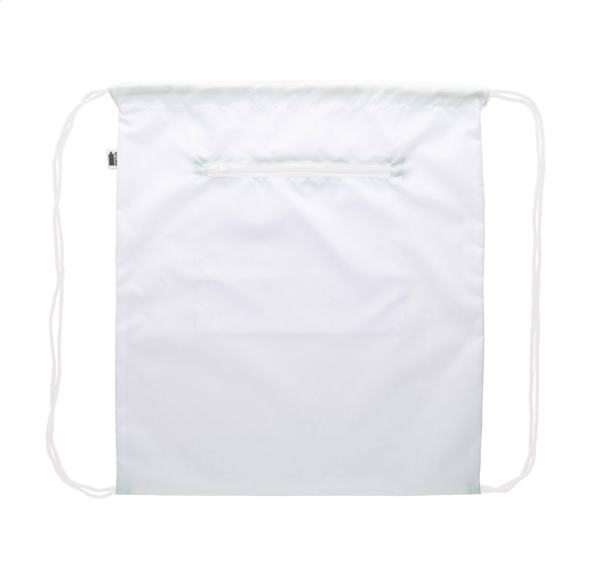 Individueller Turnbeutel mit Kordelzug und Fach mit RFID-Schutz mit Reißverschluss, Material: 190T RPET-Polyester. Der Preis ist inkl. Sublimationsdruck und RPET-Label. Mindestmenge: 25 Stk.
