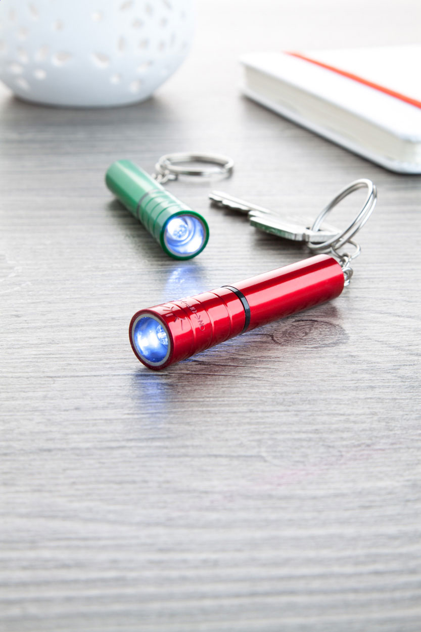 Mini-Taschenlampe aus Kunststoff mit weißem LED-Licht, Metallic-Oberfläche und Metall-Schlüsselring. Inkl. Knopfzellenbatterie.