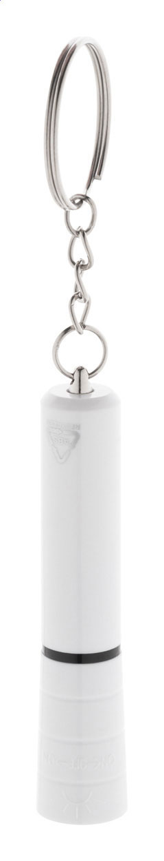 Mini-Taschenlampe aus recyceltem ABS-Kunststoff mit 1 LED, eleganter Metallic-Oberfläche und Metallschlüsselring. Inkl. Knopfzellenbatterie.