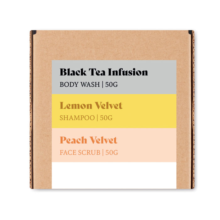 Unisex-Körperpflege-Set von Branded By Earth für die Reise. Enthält je 50 g vegane Duschseife, Shampoo und Gesichtspeeling in fester Form. Je in einer kleinen Dose. Lieferung in einer Box aus recyceltem Papier. Hergestellt in der EU.