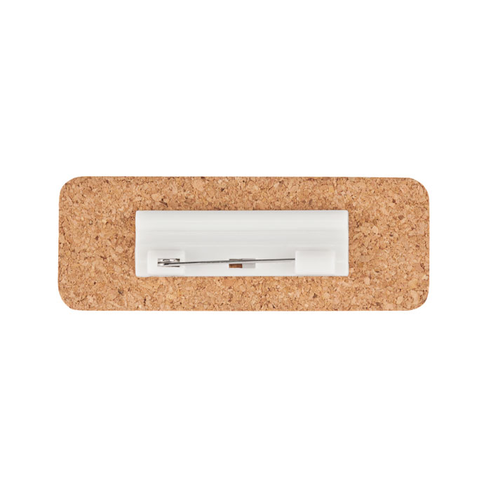 Namensschild aus Kork. Sicherheitsnadel zum variablen Anstecken.